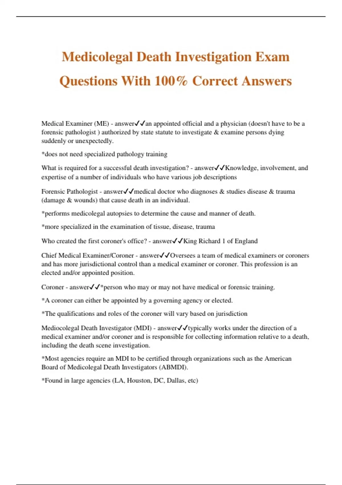 Medicolegal Death Investigation Exam Questions With 100% Correct Answers Medical Examiner (ME) - answeran appointed official and a physician (doesn't have to be a forensic pathologist ) authorized by state statute to investigate & examine persons dying suddenly or unexpectedly. *does not need specialized pathology training What is required for a successful death investigation? - answerKnowledge, involvement, and expertise of a number of individuals who have various job descriptions Forensic Pathologist - answermedical doctor who diagnoses & studies disease & trauma (damage & wounds) that cause death in an individual. *performs medicolegal autopsies to determine the cause and manner of death. *more specialized in the examination of tissue, disease, trauma Who created the first coroner's office? - answerKing Richard 1 of England Chief Medical Examiner/Coroner - answerOversees a team of medical examiners or coroners and has more jurisdictional control than a medical examiner or coroner. This profession is an elected and/or appointed position. Coroner - answer*person who may or may not have medical or forensic training. *A coroner can either be appointed by a governing agency or elected. *The qualifications and roles of the coroner will vary based on jurisdiction Mediocolegal Death Investigator (MDI) - answertypically works under the direction of a medical examiner and/or coroner and is responsible for collecting information relative to a death, including the death scene investigation. *Most agencies require an MDI to be certified through organizations such as the American Board of Medicolegal Death Investigators (ABMDI). *Found in large agencies (LA, Houston, DC, Dallas, etc)