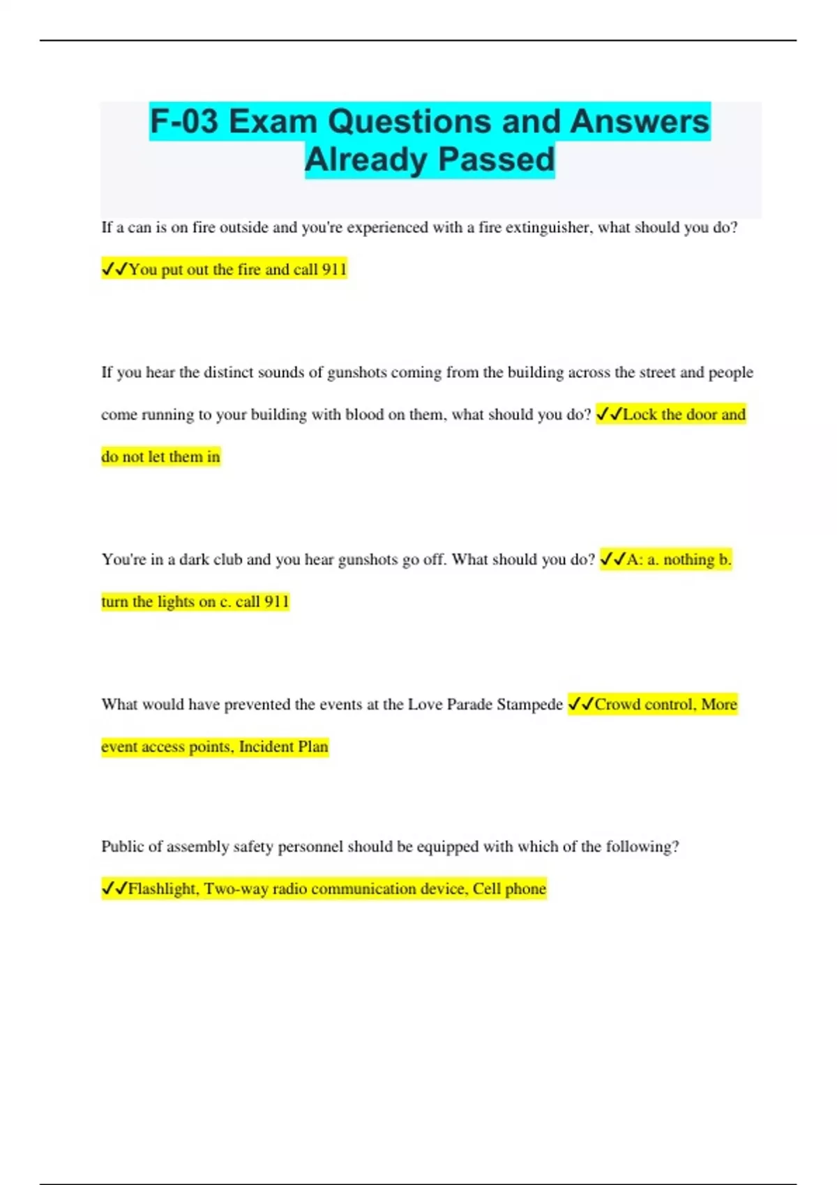 F-03 Exam Questions and Answers Already Passed If a can is on fire outside and you're experienced with a fire extinguisher, what should you do? You put out the fire and call 911 If you hear the distinct sounds of gunshots coming from the building across the street and people come running to your building with blood on them, what should you do? Lock the door and do not let them in You're in a dark club and you hear gunshots go off. What should you do? A: a. nothing b. turn the lights on c. call 911 What would have prevented the events at the Love Parade Stampede Crowd control, More event access points, Incident Plan Public of assembly safety personnel should be equipped with which of the following? Flashlight, Two-way radio communication device, Cell phone What's the specific amount of people needed in space for a fireguard to be present? For inside, it's 75; For outside, it's 200 When and where are the place of assembly safety personnel required? Cabarets, Dance halls, Indoor skating rinks, Bowling alleys, Museums, Bingo halls,Movie theaters Or Television/radio studios admitting an audience, Sports arenas, Circuses, Performing art theaters (live), Stadiums, Passenger terminal How many place of assembly safety personnel will be required? the number of minimum safety personnel will be indicated in the TPA permit. Assembly Areas A designated area outside of a building to which building occupants are directed to report upon implementation of a partial evacuation. Building Information Card The commissioner may require by rule the preparation of a building information card depicting and/or setting forth the relevant fire safety information for a building. Building Occupants All persons in the building, including employees, building personnel and visitors Emergency Health Care Facility A sheltered area or building either naturally or artificially so lighted as will promote the health and safety of patients provided emergency medical care, and containing cot(s) and/or litter(s) and emergency medical equipment and supplies as required by New York State Sanitary Code PART - 18.2. Evacuation The emptying of a building of all building occupants in response to a fire or an emergency. Fire Safety and Evacuation Plan A written plan which sets forth the circumstances and procedures for the in-building relocation, partial evacuation or evacuation of building occupants, required or as appropriate for such occupancy or building type, in response to a fire. FSP Staff The individuals identified in a fire safety and evacuation plan as responsible for the implementation of such plan. Fire Safety/EAP Director The employee designated by the owner to perform duties of such position, and who possesses the requisite qualifications and training, as set forth in Fire Rules. Fire Drill Training exercise by which building
