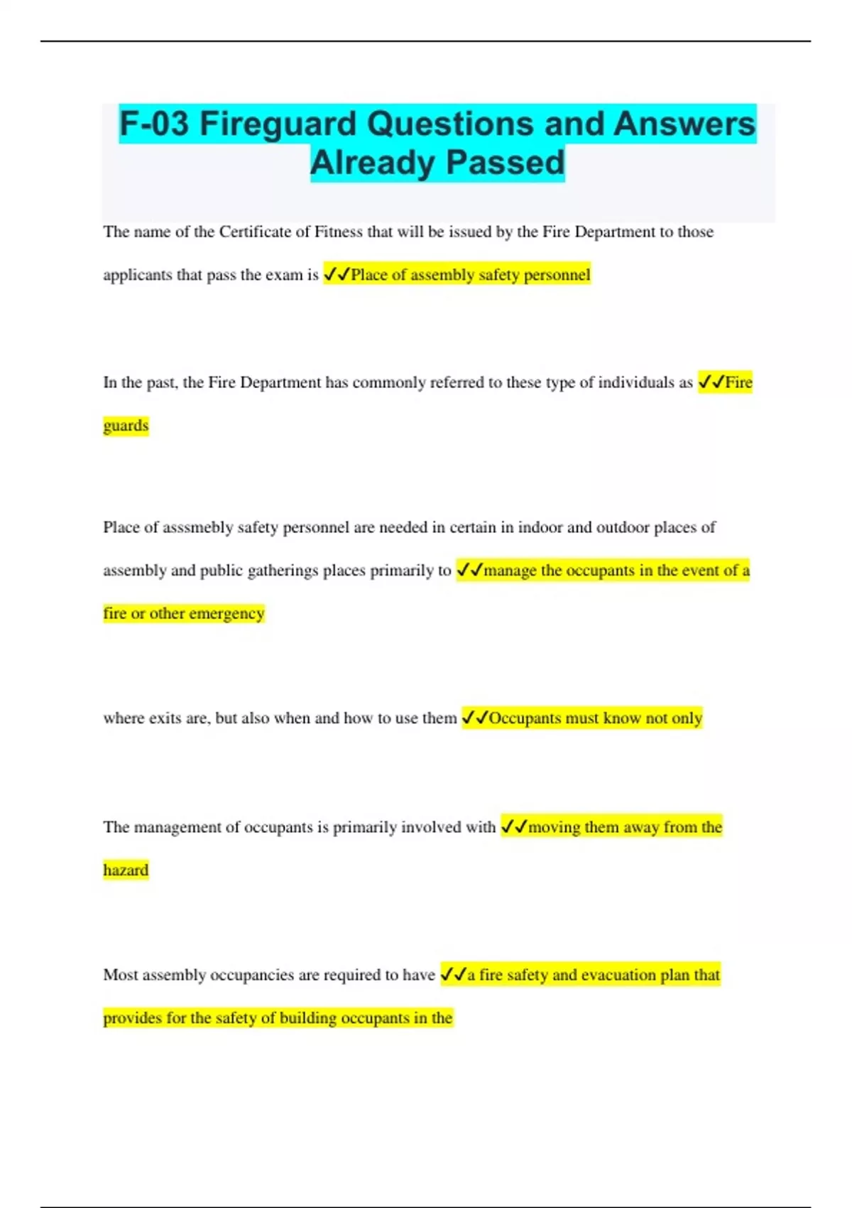 F-03 Fireguard Questions and Answers Already Passed The name of the Certificate of Fitness that will be issued by the Fire Department to those applicants that pass the exam is Place of assembly safety personnel In the past, the Fire Department has commonly referred to these type of individuals as Fire guards Place of asssmebly safety personnel are needed in certain in indoor and outdoor places of assembly and public gatherings places primarily to manage the occupants in the event of a fire or other emergency where exits are, but also when and how to use them Occupants must know not only The management of occupants is primarily involved with moving them away from the hazard Most assembly occupancies are required to have a fire safety and evacuation plan that provides for the safety of building occupants in the event of fire or other emergency The plan must consider The number and capabilities of building occupants, the type, the location and arrangement of building exits; the fire and it's effects on the people and the building and the number Lighting conditions in assembly spaces may interfere with the occupants ability to discern the path of egress travel. FDNY may require at least one place of assembly safety personnel in the premises where the certificate of occupancy indicates the number of 75 or more members may gather indoor or 200 or more may gather outdoors For the temporary place of assembly situations the number of minimum safety personnel will be indicated in the TPA permit For the TPA events, the safety personnel are recommended to arrive at the premises at least 1 hour prior to the events and stay until all audience members leave The certificate of fitness holder must __________ upon his or her person, or otherwise readily available for inspection by any representative of the Department keep the Certifiacte of Fitness The individuals identified in a fire safety and evacuation plan as responsible for the implemenation of such plan FSP Staff The employee designated by the owner to perform duties of such position and who possessses the requisite qualifications and training, as set forth in Fire