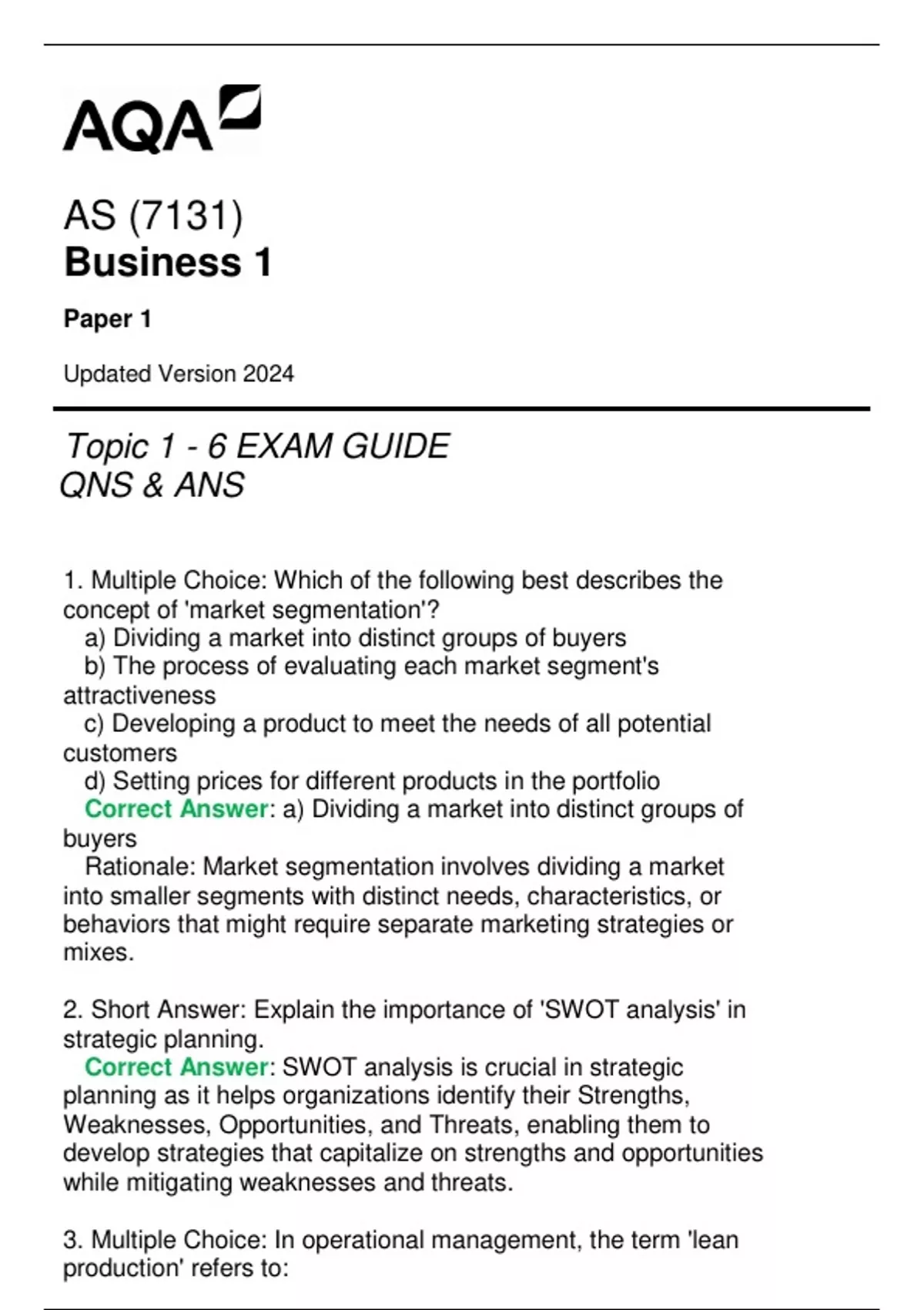 (7131) AQA AS Business 1 Paper 1 Exam Guide Qns & Ans Updated Version 2024