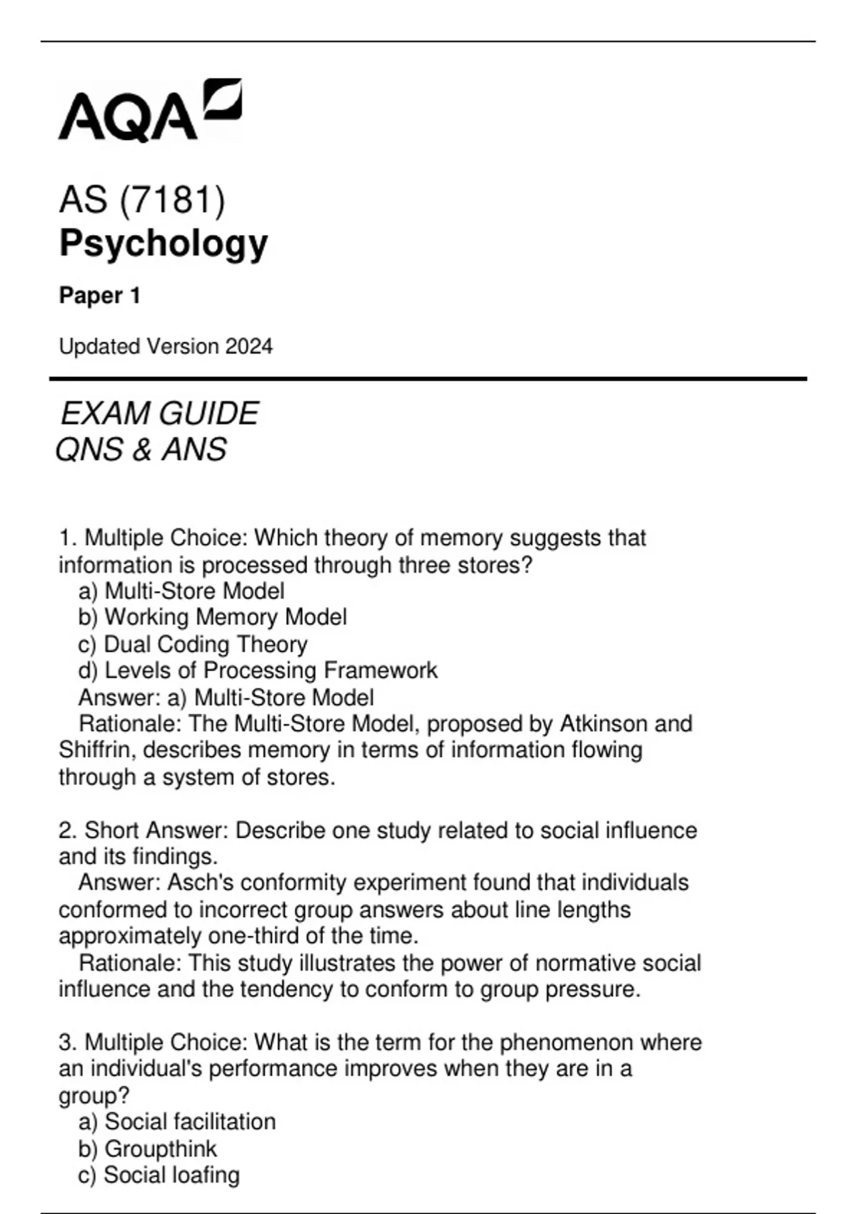 (7181) AQA AS Psychology Paper 1 Exam Guide Qns & Ans Updated Version 2024.(7181) AQA AS Psychology Paper 1 Exam Guide Qns & Ans Updated Version 2024.(7181) AQA AS Psychology Paper 1 Exam Guide Qns & Ans Updated Version 2024.