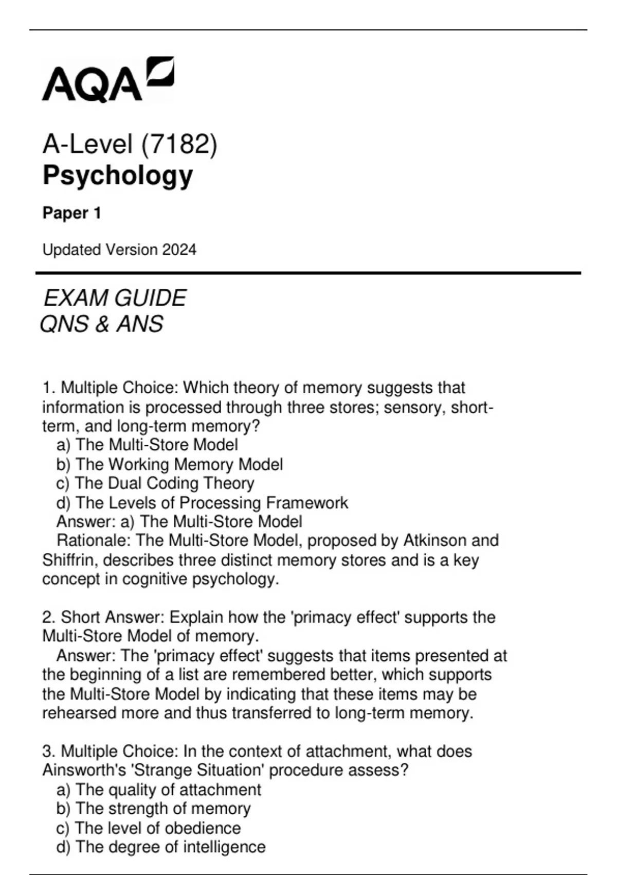 (7182) AQA A-Level Psychology Paper 1 Exam Guide Qns & Ans Updated Version 2024.