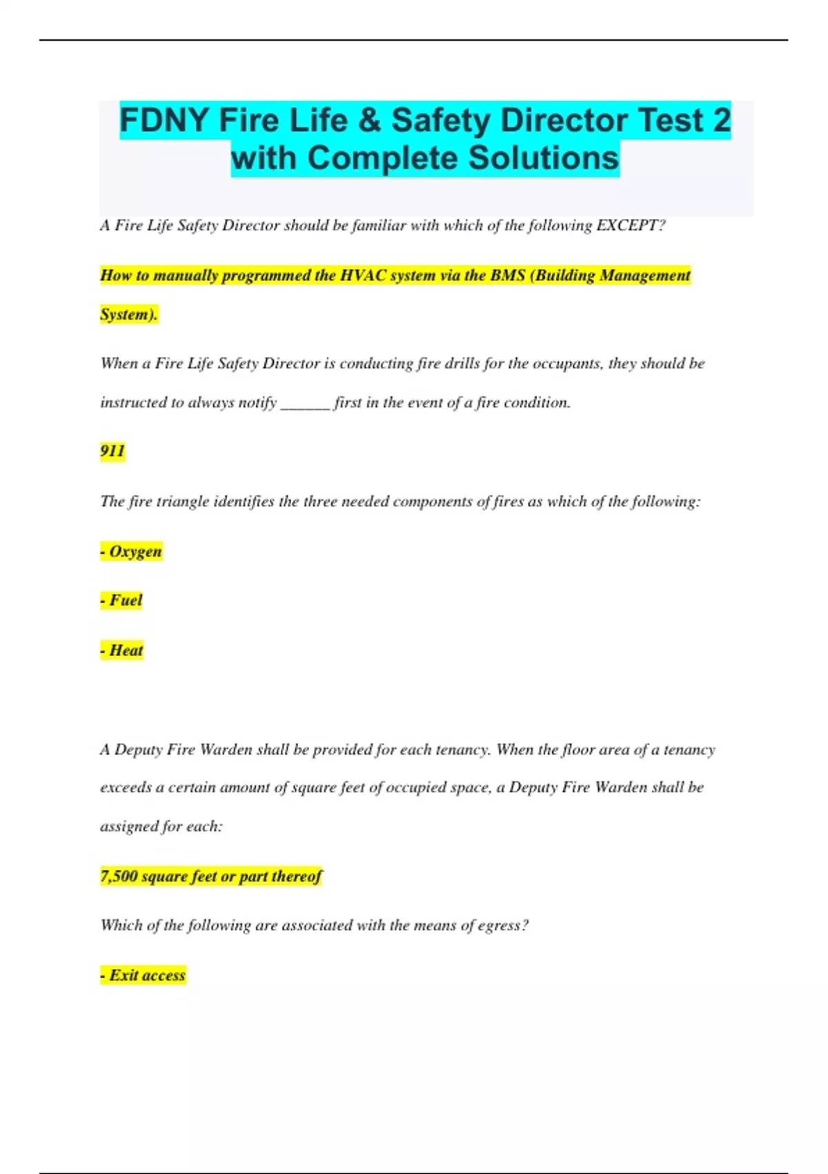 FDNY Fire Life & Safety Director Test 2 with Complete Solutions A Fire Life Safety Director should be familiar with which of the following EXCEPT? How to manually programmed the HVAC system via the BMS (Building Management System). When a Fire Life Safety Director is conducting fire drills for the occupants, they should be instructed to always notify ______ first in the event of a fire condition. 911 The fire triangle identifies the three needed components of fires as which of the following: - Oxygen - Fuel - Heat A Deputy Fire Warden shall be provided for each tenancy. When the floor area of a tenancy exceeds a certain amount of square feet of occupied space, a Deputy Fire Warden shall be assigned for each: 7,500 square feet or part thereof Which of the following are associated with the means of egress? - Exit access - Exit - Exit discharge Fire drills in a new office building must be conducted at least _________ in the first 2 years following acceptance of a Comprehensive Fire Safety and Emergency Action Plan. Quarterly During a fire drill, occupants should be instructed to FIRST notify _____ in the event of a fire 911 The qualified building service employees who consists of the Fire FLS Brigade are organized, selected and trained by: The Fire Life Safety Director Which type of detector will activate the alarm when the room temperature increases at a rapid rate (12-15 degrees F per minute)? The alarm will reset itself, when the room temperature returns back to normal. Rate-of-rise heat detector The primary purpose of the ___________ is to process signals received from initiating devices and to activate appropriate signals and outputs. Fire alarm control panel A supply of at least six spare sprinkler heads must be kept available on the premises near what location? Main control valve ________ emergency in-car operation allows fire fighters to control the elevator, and travel to any floor served by the elevator. The operating controls are located inside the elevator car. Only trained personnel or first responders should use this feature. Phase II What type of fire protection device will automatically recall elevators to the designated landing? Elevator lobby smoke detectors If you are looking at a stairway door and notice a number on the door, which of the following is TRUE? You're on the stair side of a door. After the test of smoke control system has been completed, the FLS Director must ensure all the required entries are made in the FLS Logbook. The required entries include all the following information, EXCEPT: (Refer to the Reference material) The manufacturer's company address The transfer of heat through solid surfaces such as metal pipes or duct-work is called: Conduction During a fire drill, the occupants should be advised that if fire alarm systems activate with no additional information, they should move ___________. At least 3 floors below their present location Which of the following conditions WILL NOT result in an automatic release of the fail-safe locks in a high rise building?