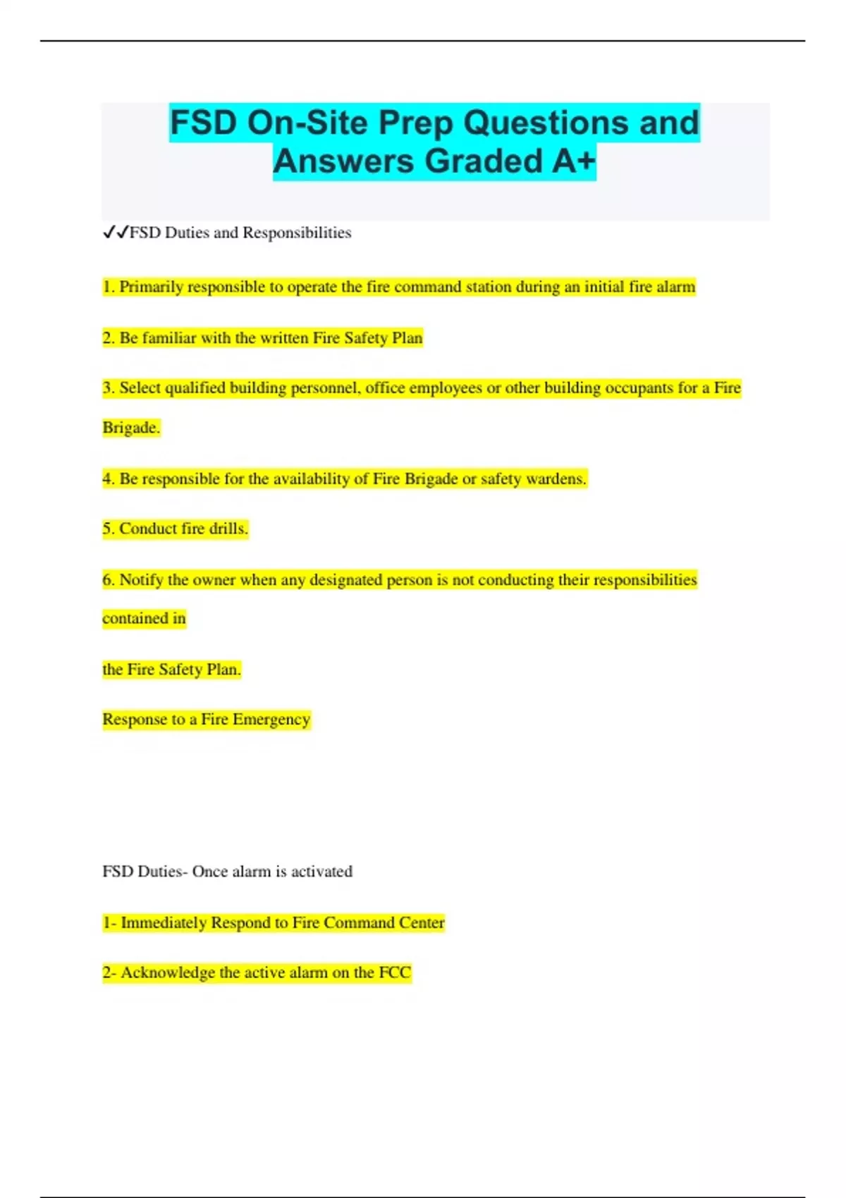 FSD On-Site Prep Questions and Answers Graded A+ FSD Duties and Responsibilities 1. Primarily responsible to operate the fire command station during an initial fire alarm 2. Be familiar with the written Fire Safety Plan 3. Select qualified building personnel, office employees or other building occupants for a Fire Brigade. 4. Be responsible for the availability of Fire Brigade or safety wardens. 5. Conduct fire drills. 6. Notify the owner when any designated person is not conducting their responsibilities contained in the Fire Safety Plan. Response to a Fire Emergency FSD Duties- Once alarm is activated 1- Immediately Respond to Fire Command Center 2- Acknowledge the active alarm on the FCC 3- Deploy Fire Brigade 4- Ensure 911 has been contacted 5- Ensure Elevators have been recalled 6- Ensure (HVAC/heating, ventilating, and air Conditioning) has been shut down. 7- Evacuation has commenced on fire floor, floor above and floor below. 8- Complete All Call Announcement 9- Complete PA Announcement with affected floors 10- Reset Panel, only upon instruction of the incident commander/Fire Department FSD upon FDNY Arrival 1- Ensure front entrance is kept clear 2- Ensure Brigade members remain on floor below fire to provide information to FDNY 3- Report conditions of fire floor and other affected floor. 4- Number and type of devices that are activated and nature of the alarm. 5- Status of stairways and evacuation status 6- Status of elevators and HVAC system 7- Any fire protection impairment in the building? 8- Any unique situations in the building such as trapped occupants disabled or injured occupants. 9- Silence alarms only upon instruction. 10- Provide BIC/ Building information Card, floor plans, master keys, elevator keys. 11- Have fire brigade members ready to escort the FD to the fire close as possible. 12- Alarm reset only upon instruction. 13- Log event in logbo FSD Duties and Responsibilities) Primarily job is to operate the fire command station during an initial fire alarm FSD Duties and Responsibilities Be familiar with the Fire Safety Plan FSD Duties and Responsibilities Select qualified building personnel, office employees or other building occupants for a Fire Brigade. FSD Duties and Responsibilities Be responsible for