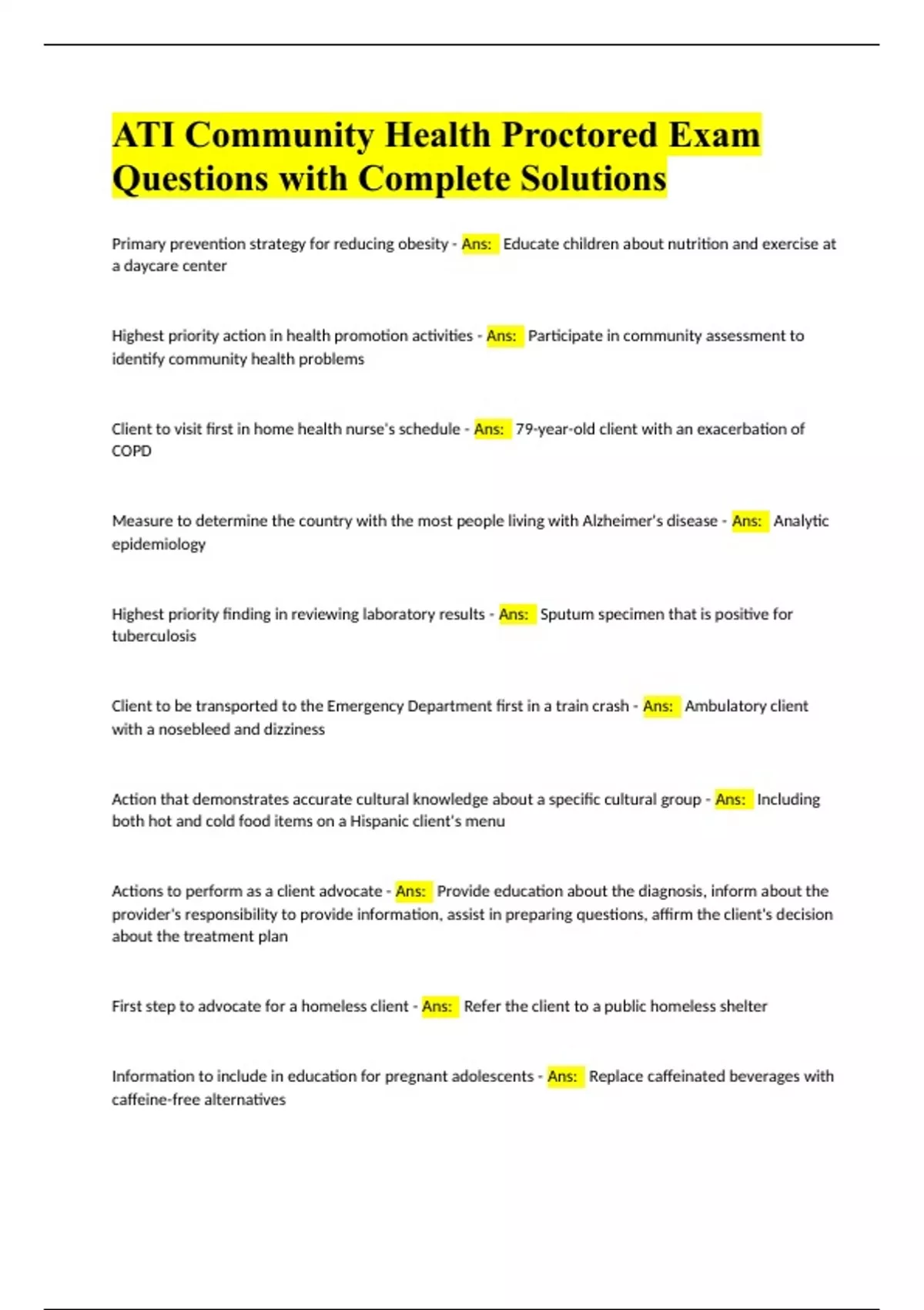 ATI Community Health Proctored Exam Questions with Complete Solutions