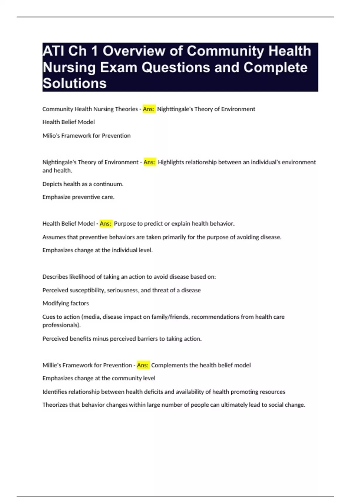 ATI Ch 1 Overview of Community Health Nursing Exam Questions and Complete Solutions.