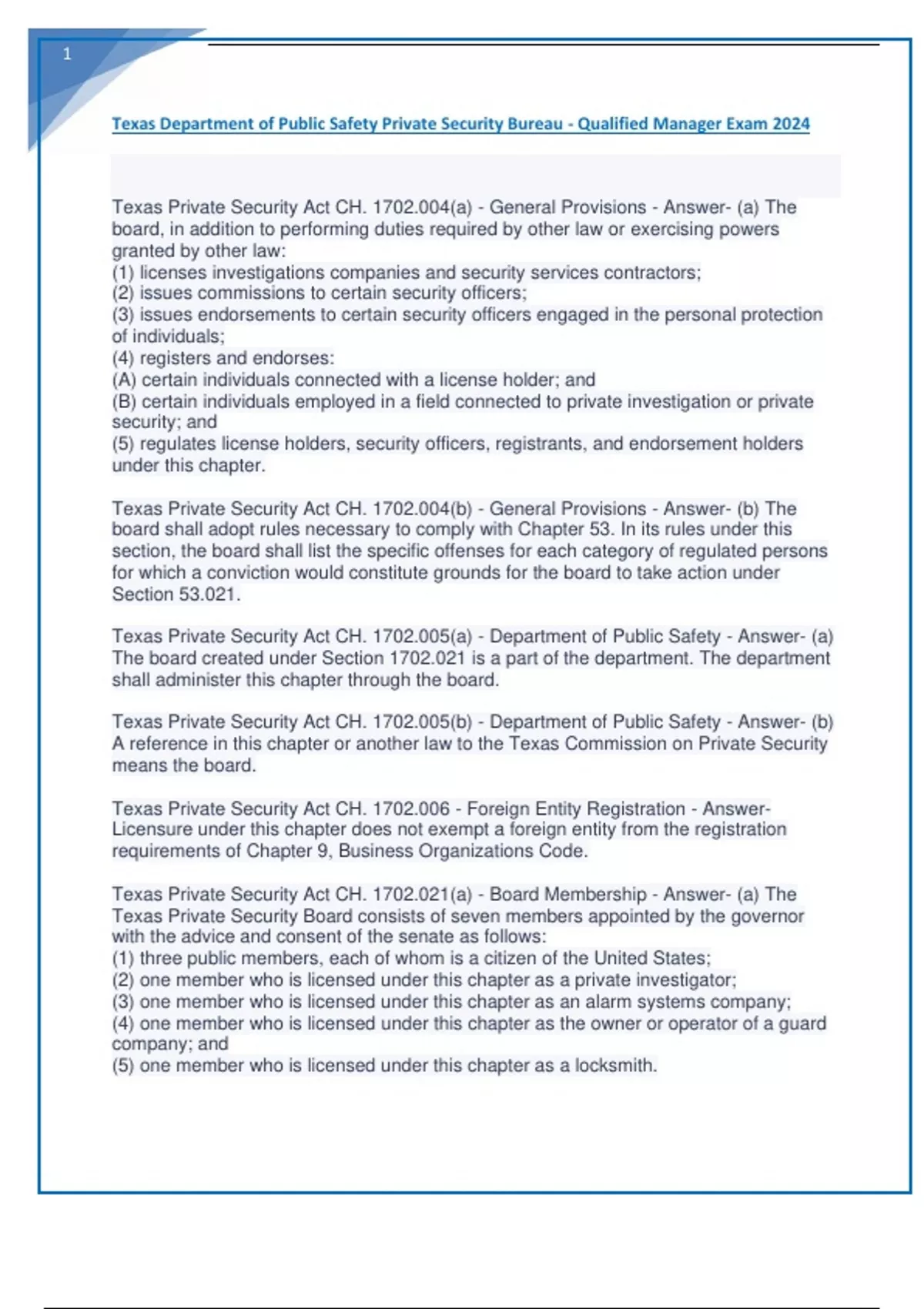 Texas Department of Public Safety, Private Security Bureau, Qualified Manager Exam 2024
