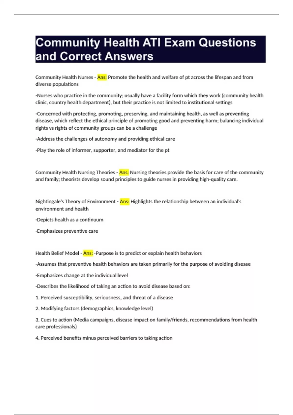 Community Health ATI Exam Questions and Correct Answers.