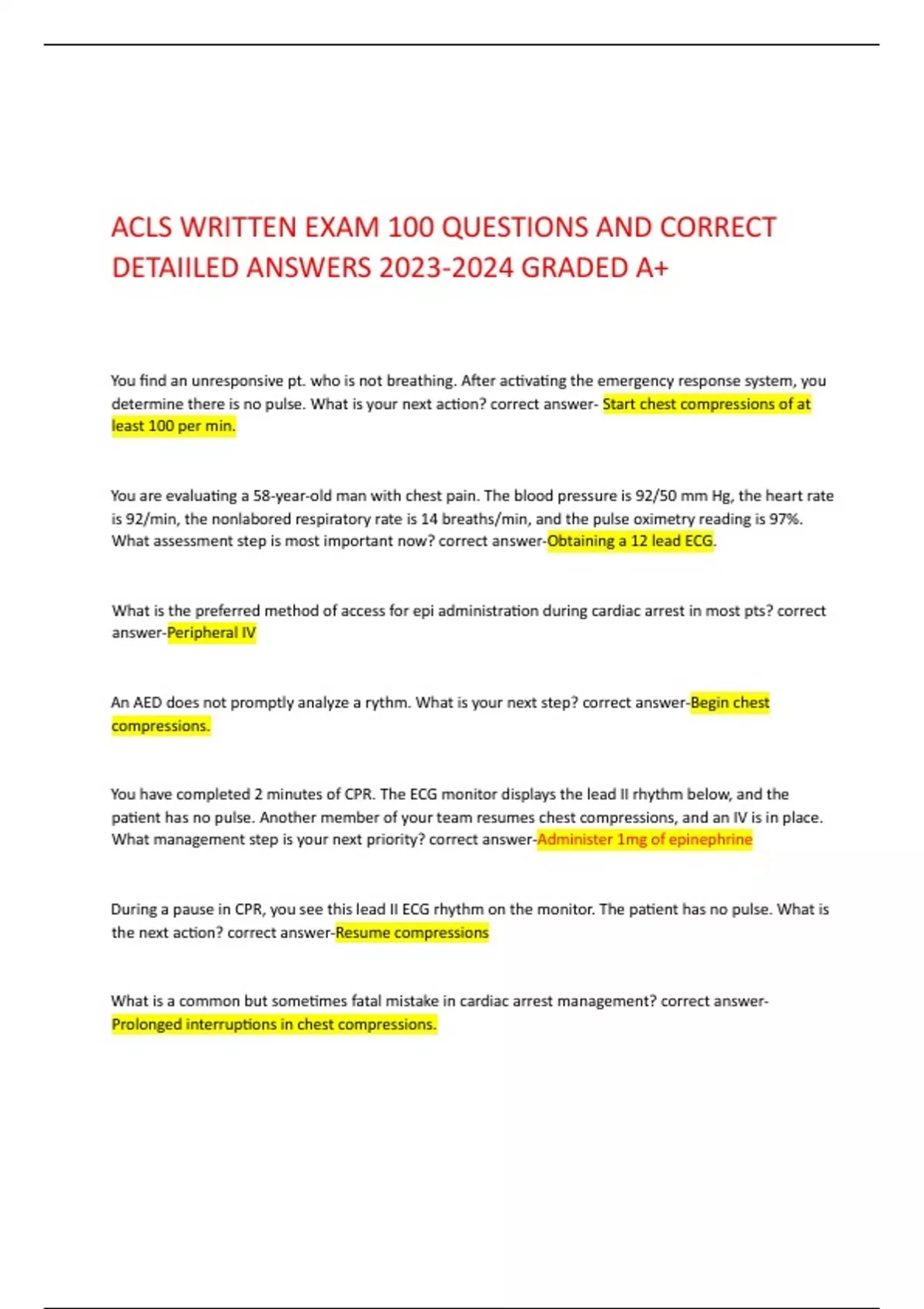 ACLS WRITTEN EXAM 100 QUESTIONS AND CORRECT DETAIILED ANSWERS GRADED A+