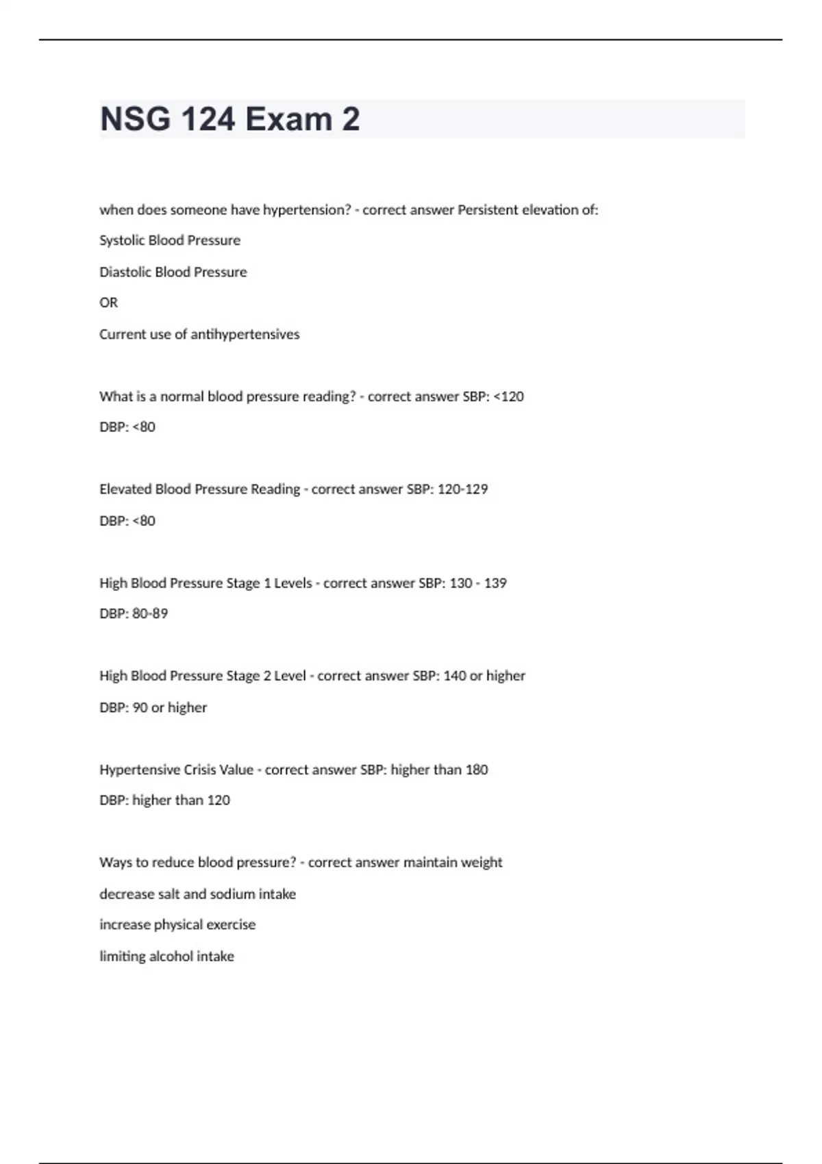 NSG 124 Exam 2 Herzing University -Question and answers 100% correctNSG 124 Exam 2 when does someone have hypertension? - correct answer Persistent elevation of: Systolic Blood Pressure Diastolic Blood Pressure OR Current use of antihypertensives What is a normal blood pressure reading? - correct answer SBP: <120 DBP: <80 Elevated Blood Pressure Reading - correct answer SBP: 120-129 DBP: <80 High Blood Pressure Stage 1 Levels - correct answer SBP: 130 - 139 DBP: 80-89 High Blood Pressure Stage 2 Level - correct answer SBP: 140 or higher DBP: 90 or higher Hypertensive Crisis Value - correct answer SBP: higher than 180 DBP: higher than 120 Ways to reduce blood pressure? - correct answer maintain weight decrease salt and sodium intake increase physical exercise limiting alcohol intake