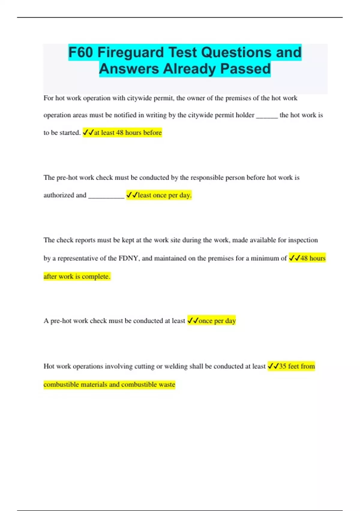 F60 Fireguard Test Questions and Answers Already Passed For hot work operation with citywide permit, the owner of the premises of the hot work operation areas must be notified in writing by the citywide permit holder ______ the hot work is to be started. at least 48 hours before The pre-hot work check must be conducted by the responsible person before hot work is authorized and __________ least once per day. The check reports must be kept at the work site during the work, made available for inspection by a representative of the FDNY, and maintained on the premises for a minimum of 48 hours after work is complete. A pre-hot work check must be conducted at least once per day Hot work operations involving cutting or welding shall be conducted at least 35 feet from combustible materials and combustible waste All other hot work operations shall be conducted at least 25 feet from combustible materials and combustible waste Sprinkler system protection ____________while hot work is performed. must not be shut off or impaired When should a Fire watch be maintained A fire watch must be maintained during any hot work operation. What other duties should the Fire Watch have while on hot water operations. The persons conducting a fire watch shall not have other duties. Where hose lines are required, they shall be connected, charged and ready for operation At least one portable fire extinguisher with a minimum 2-A:20-B:C How far away should one fire extinguisher be from any operation 30 feet The fire watch for torch operations conducted at the following three locations shall be conducted by at least one F-60 fire guard (1)Construction sites.