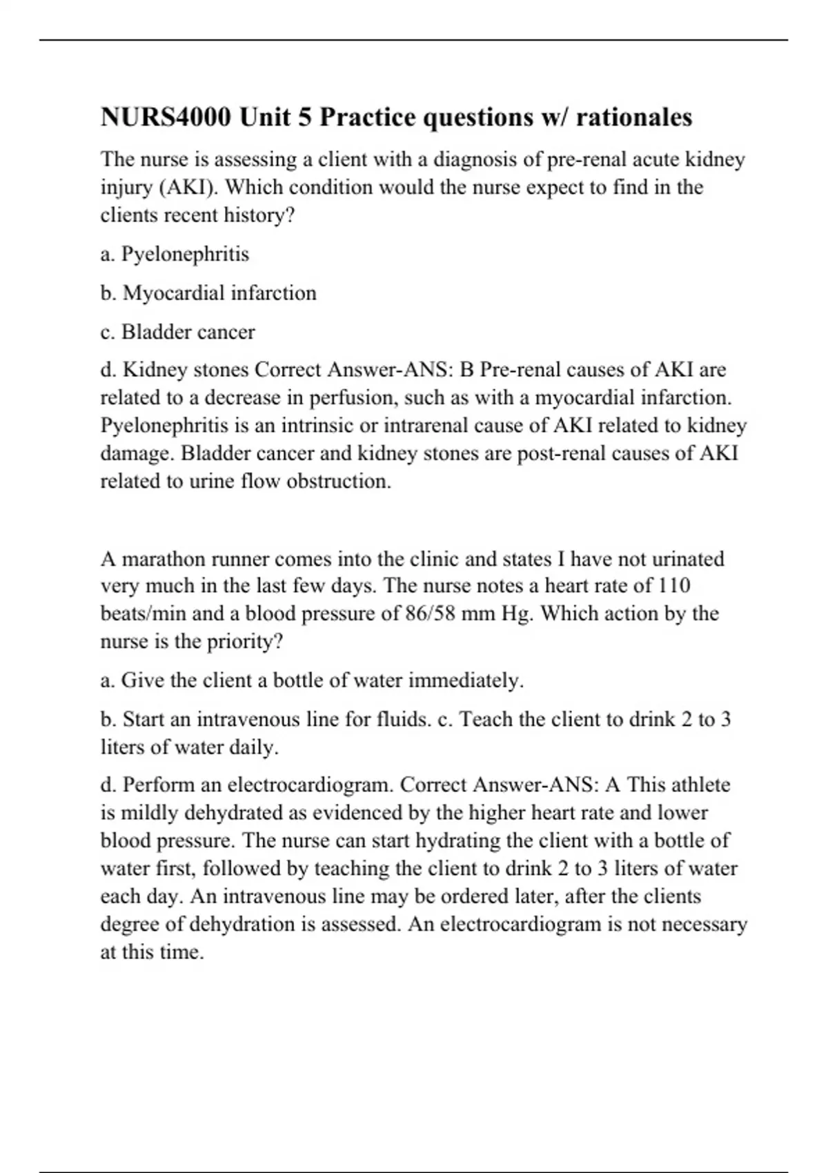 The nurse is assessing a client with a diagnosis of pre-renal acute kidney injury (AKI). Which condition would the nurse expect to find in the clients recent history? a. Pyelonephritis b. Myocardial infarction c. Bladder cancer d. Kidney stones Correct Answer-ANS: B Pre-renal causes of AKI are related to a decrease in perfusion, such as with a myocardial infarction. Pyelonephritis is an intrinsic or intrarenal cause of AKI related to kidney damage. Bladder cancer and kidney stones are post-renal causes of AKI related to urine flow obstruction. A marathon runner comes into the clinic and states I have not urinated very much in the last few days. The nurse notes a heart rate of 110 beats/min and a blood pressure of 86/58 mm Hg. Which action by the nurse is the priority? a. Give the client a bottle of water immediately. b. Start an intravenous line for fluids. c. Teach the client to drink 2 to 3 liters of water daily. d. Perform an electrocardiogram. Correct Answer-ANS: A This athlete is mildly dehydrated as evidenced by the higher heart rate and lower blood pressure. The nurse can start hydrating the client with a bottle of water first, followed by teaching the client to drink 2 to 3 liters of water each day. An intravenous line may be ordered later, after the clients degree of dehydration is assessed. An electrocardiogram is not necessary at this time. A male client comes into the em