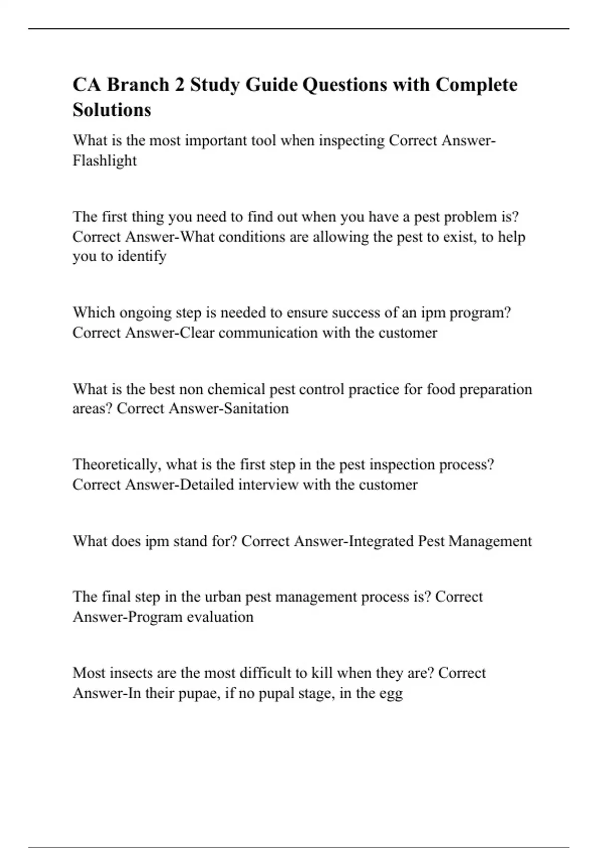 What is the most important tool when inspecting Correct Answer-Flashlight The first thing you need to find out when you have a pest problem is? Correct Answer-What conditions are allowing the pest to exist, to help you to identify Which ongoing step is needed to ensure success of an ipm program? Correct Answer-Clear communication with the customer What is the best non chemical pest control practice for food preparation areas? Correct Answer-Sanitation Theoretically, what is the first step in the pest inspection process? Correct Answer-Detailed interview with the customer What does ipm stand for? Correct Answer-Integrated Pest Management The final step in the urban pest management process is? Correct Answer-Program evaluation Most insects are the most difficult