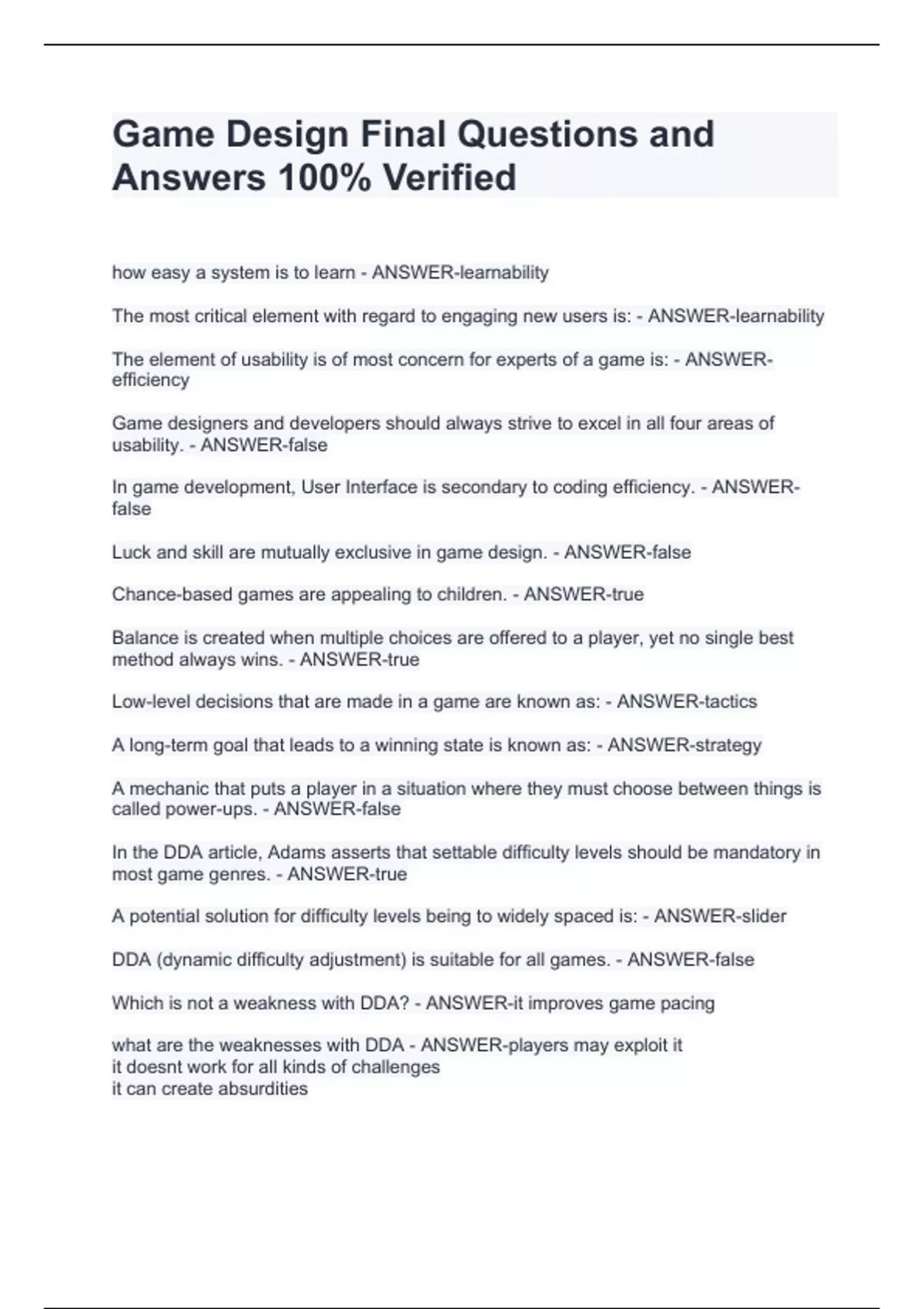 Game Design Final Questions and Answers 100% VerifiedGame Design Final Questions and Answers 100% VerifiedGame Design Final Questions and Answers 100% VerifiedGame Design Final Questions and Answers 100% VerifiedGame Design Final Questions and Answers 100% Verified how easy a system is to learn - ANSWER-learnability The most critical element with regard to engaging new users is: - ANSWER-learnability The element of usability is of most concern for experts of a game is: - ANSWER-efficiency Game designers and developers should always strive to excel in all four areas of usability. - ANSWER-false