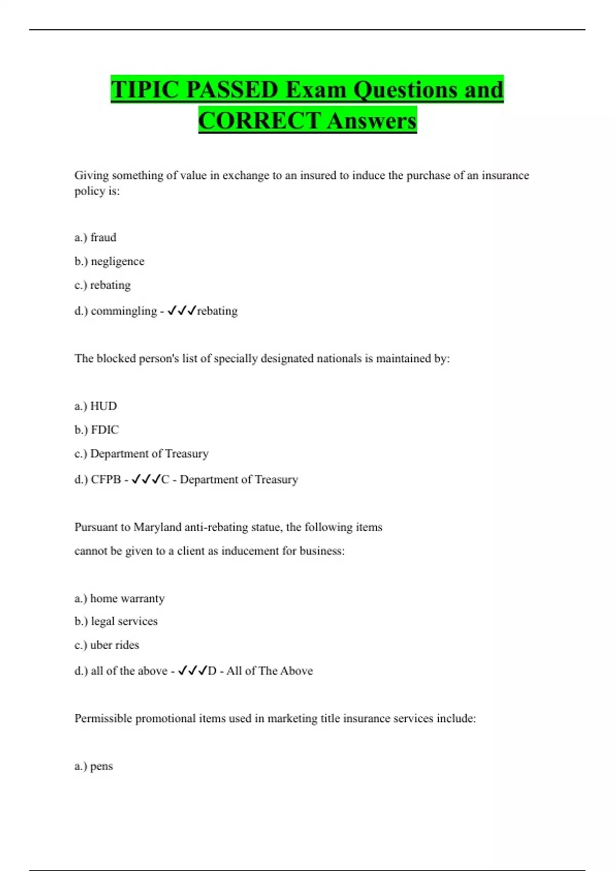 TIPIC PASSED Exam Questions and CORRECT Answers