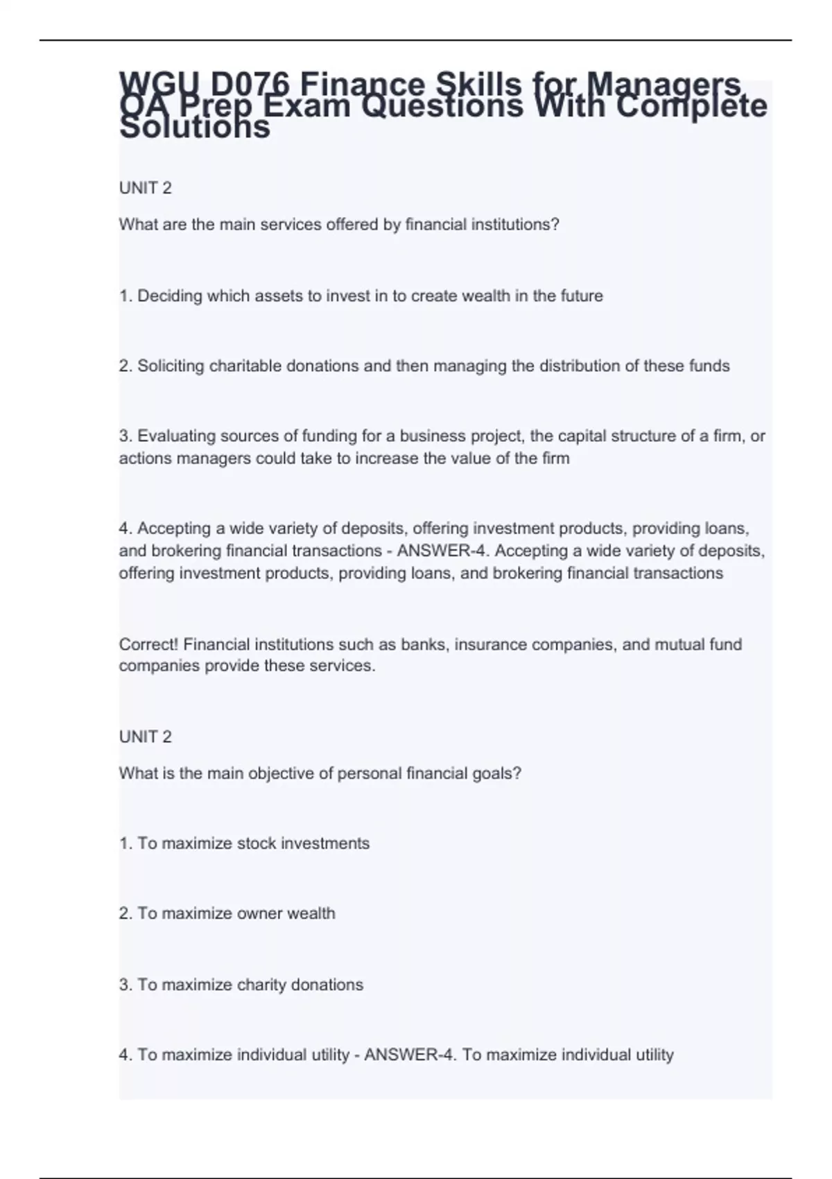 UNIT 2 What are the main services offered by financial institutions? 1. Deciding which assets to invest in to create wealth in the future 2. Soliciting charitable donations and then managing the distribution of these funds 3. Evaluating sources of funding for a business project, the capital structure of a firm, or actions managers could take to increase the value of the firm 4. Accepting a wide variety of deposits, offering investment products, providing loans, and brokering financial transactions - ANSWER-4. Accepting a wide variety of deposits, offering investment products, providing loans, and brokering financial transactions Correct! Financial institutions such as banks, insurance companies, and mutual fund companies provide these services. UNIT 2 What is the main objective of personal financial goals? 1. To maximize stock investments 2. To maximize owner wealth 3. To maximize charity donations 4. To maximize individual utility - ANSWER-4. To maximize individual utility Correct! You set goals and act to increase your satisfaction or happiness by taking care of necessities and achieving priorities.