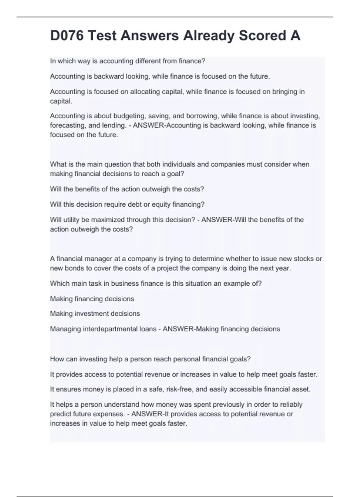 In which way is accounting different from finance? Accounting is backward looking, while finance is focused on the future. Accounting is focused on allocating capital, while finance is focused on bringing in capital. Accounting is about budgeting, saving, and borrowing, while finance is about investing, forecasting, and lending. - ANSWER-Accounting is backward looking, while finance is focused on the future. What is the main question that both individuals and companies must consider when making financial decisions to reach a goal? Will the benefits of the action outweigh the costs? Will this decision require debt or equity financing? Will utility be maximized through this decision? - ANSWER-Will the benefits of the action outweigh the costs? A financial manager at a company is trying to determine whether to issue new stocks or new bonds to cover the costs of a project the company is doing the next year. Which main task in business finance is this situation an example of? Making financing decisions Making investment decisions Managing interdepartmental loans - ANSWER-Making financing decisions How can investing help a person reach personal financial goals? It provides access to potential revenue or increases in value to help meet goals faster. It ensures money is placed in a safe, risk-free, and easily accessible financial asset. It helps a person understand how money was spent previously in order to reliably predict future expenses. - ANSWER-It provides access to potential revenue or increases in value to help meet goals faster.