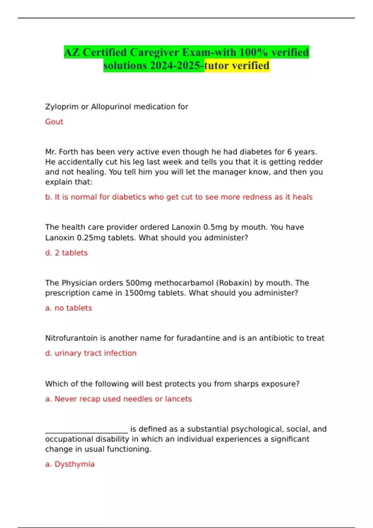 AZ Certified Caregiver Exam-with 100% verified solutions -tutor verified
