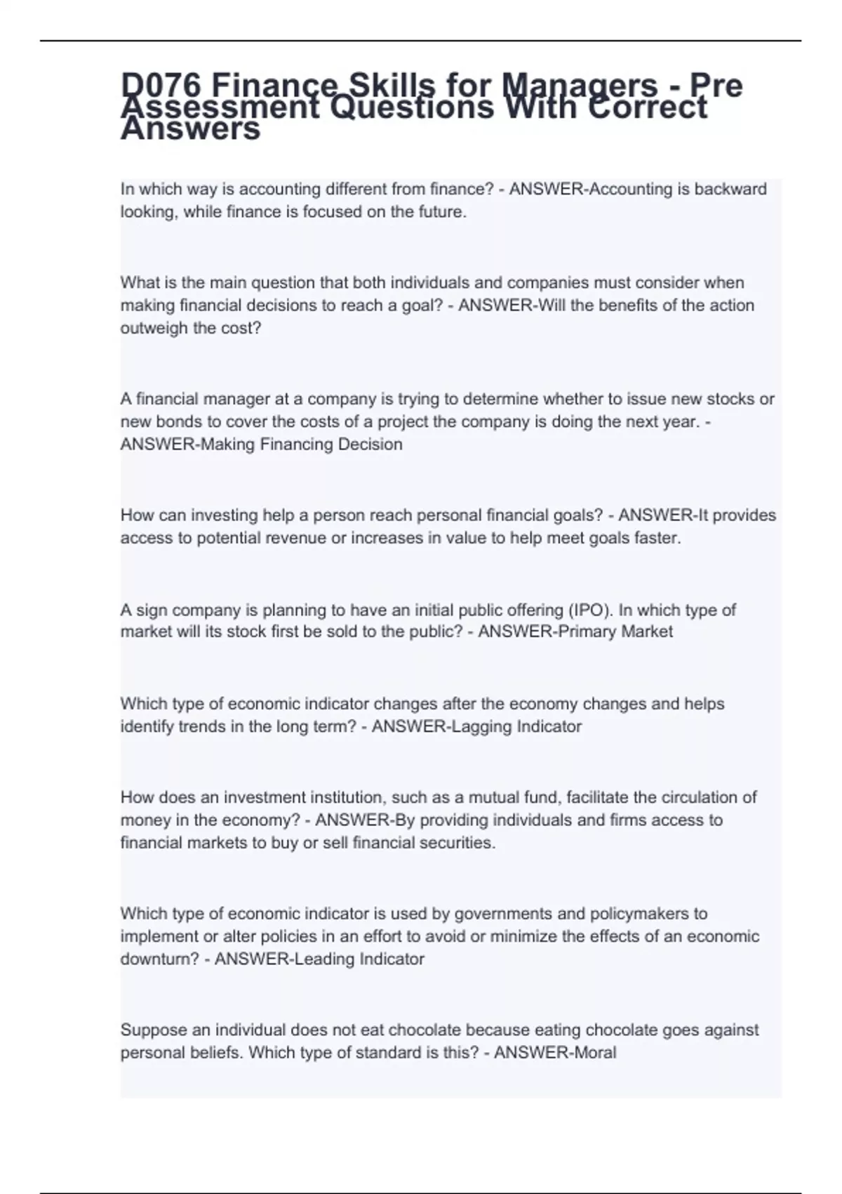 D076 Finance Skills for Managers - Pre Assessment Questions With Correct Answers