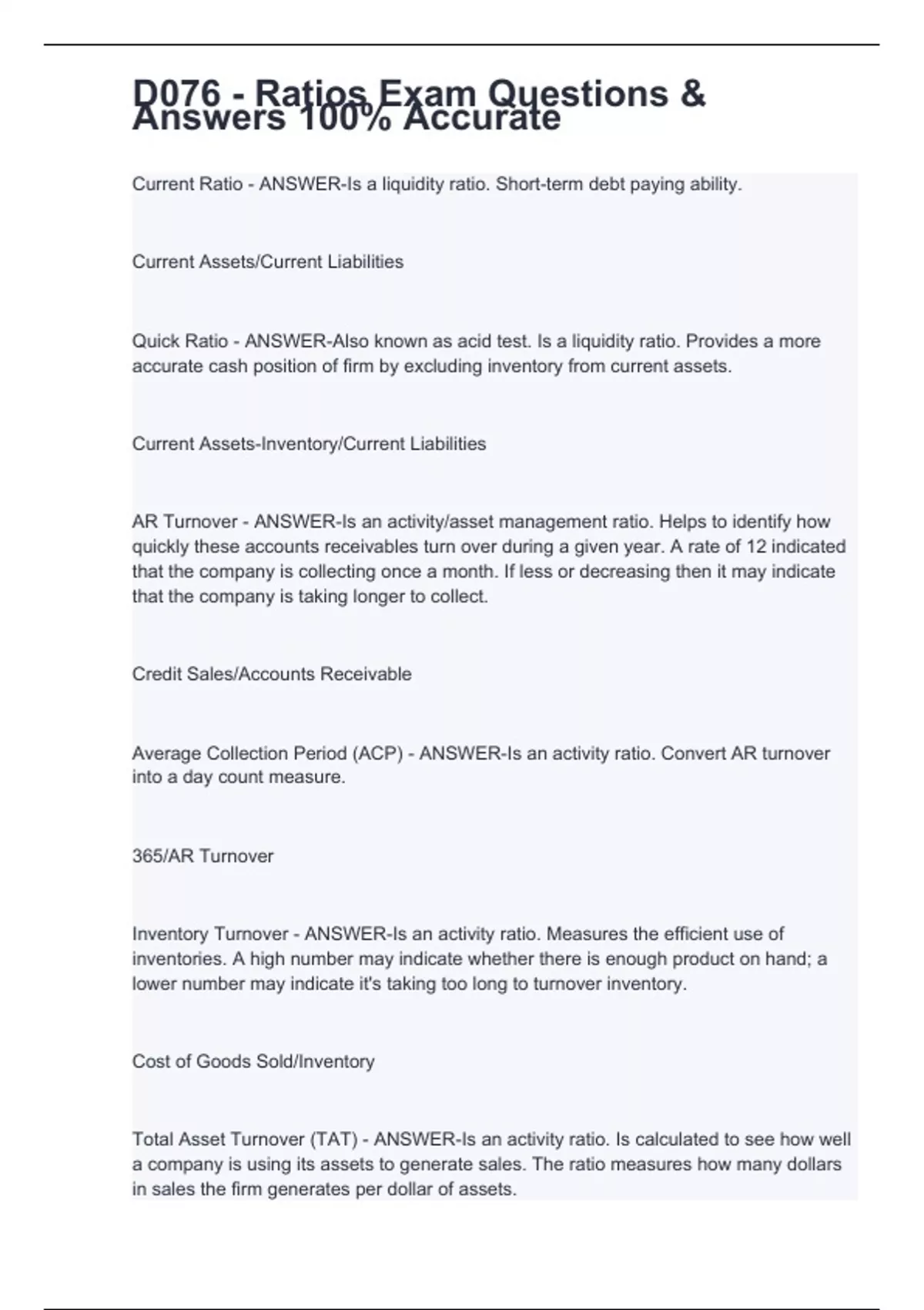 Current Ratio - ANSWER-Is a liquidity ratio. Short-term debt paying ability. Current Assets/Current Liabilities Quick Ratio - ANSWER-Also known as acid test. Is a liquidity ratio. Provides a more accurate cash position of firm by excluding inventory from current assets. Current Assets-Inventory/Current Liabilities AR Turnover - ANSWER-Is an activity/asset management ratio. Helps to identify how quickly these accounts receivables turn over during a given year. A rate of 12 indicated that the company is collecting once a month. If less or decreasing then it may indicate that the company is taking longer to collect. Credit Sales/Accounts Receivable Average Collection Period (ACP) - ANSWER-Is an activity ratio. Convert AR turnover into a day count measure. 365/AR Turnover Inventory Turnover - ANSWER-Is an activity ratio. Measures the efficient use of inventories. A high number may indicate whether there is enough product on hand; a lower number may indicate it's taking too long to turnover inventory. Cost of Goods Sold/Inventory Total Asset Turnover (TAT) - ANSWER-Is an activity ratio. Is calculated to see how well a company is using its assets to generate sales. The ratio measures how many dollars in sales the firm generates per dollar of assets.