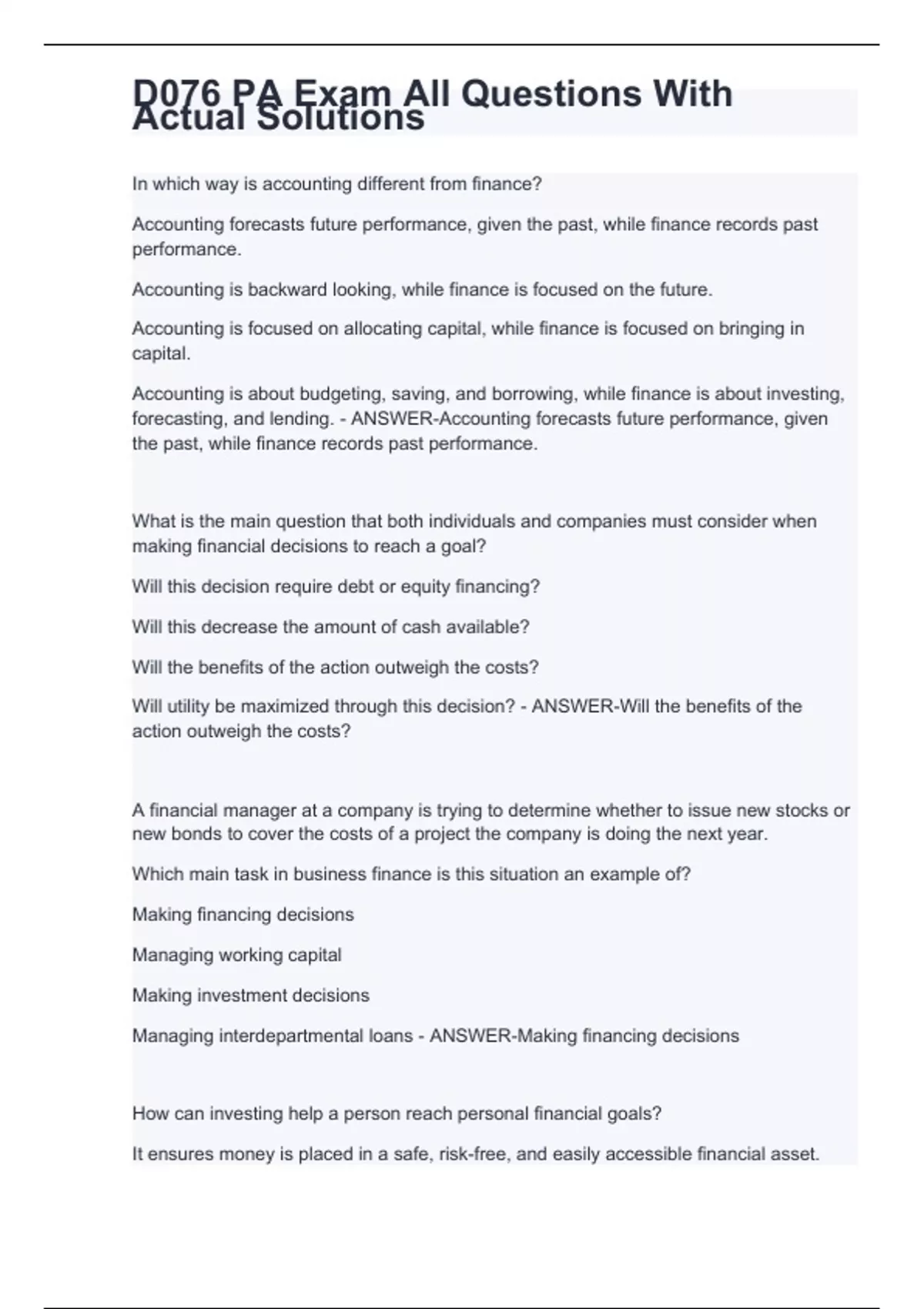 In which way is accounting different from finance? Accounting forecasts future performance, given the past, while finance records past performance. Accounting is backward looking, while finance is focused on the future. Accounting is focused on allocating capital, while finance is focused on bringing in capital. Accounting is about budgeting, saving, and borrowing, while finance is about investing, forecasting, and lending. - ANSWER-Accounting forecasts future performance, given the past, while finance records past performance. What is the main question that both individuals and companies must consider when making financial decisions to reach a goal? Will this decision require debt or equity financing? Will this decrease the amount of cash available? Will the benefits of the action outweigh the costs? Will utility be maximized through this decision? - ANSWER-Will the benefits of the action outweigh the costs? A financial manager at a company is trying to determine whether to issue new stocks or new bonds to cover the costs of a project the company is doing the next year. Which main task in business finance is this situation an example of? Making financing decisions Managing working capital Making investment decisions Managing interdepartmental loans - ANSWER-Making financing decisions How can investing help a person reach personal financial goals?