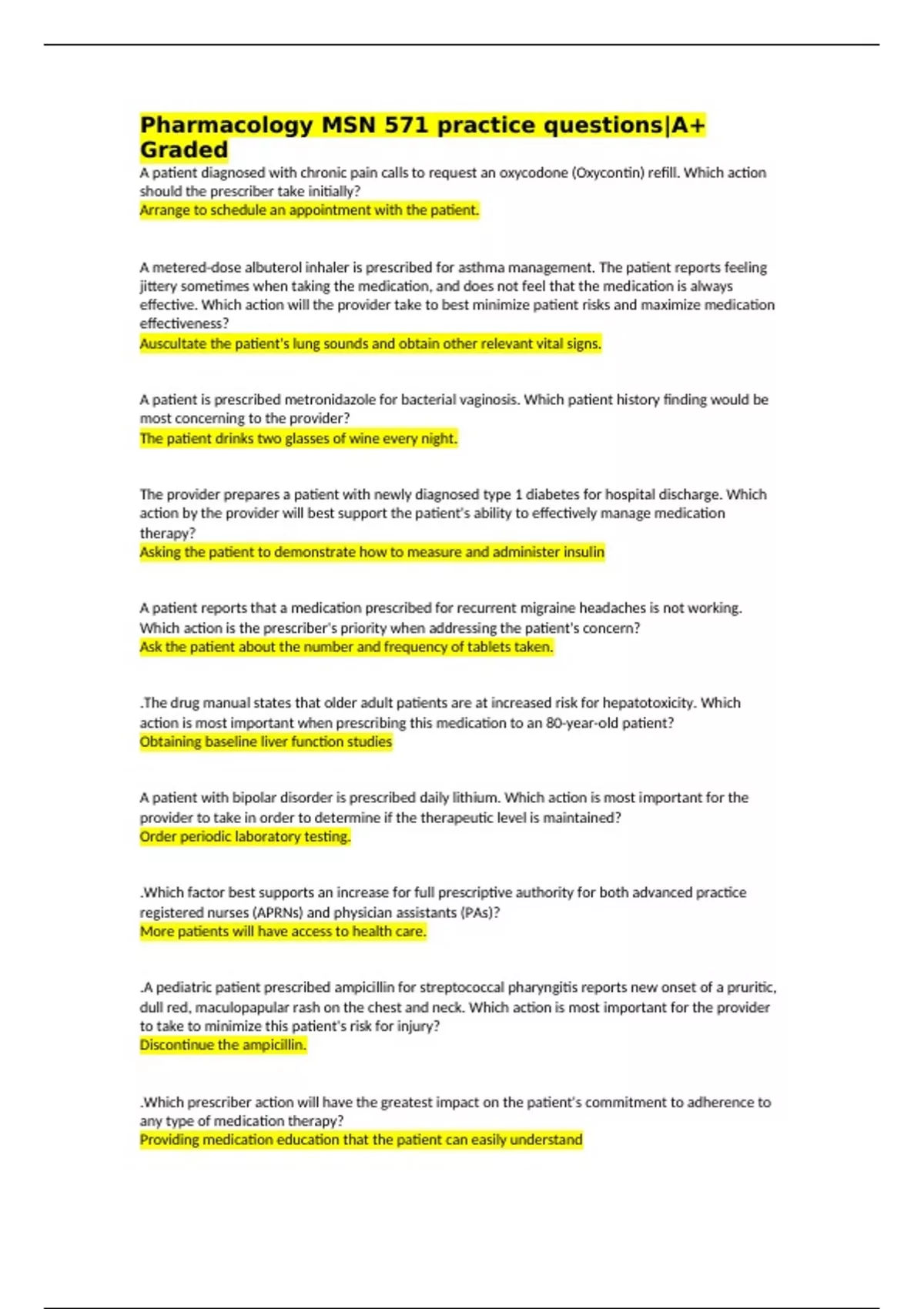 Pharmacology MSN 571 practice questions|A+ Graded A patient diagnosed with chronic pain calls to request an oxycodone (Oxycontin) refill. Which action should the prescriber take initially? Arrange to schedule an appointment with the patient. A metered-dose albuterol inhaler is prescribed for asthma management. The patient reports feeling jittery sometimes when taking the medication, and does not feel that the medication is always effective. Which action will the provider take to best minimize patient risks and maximize medication effectiveness? Auscultate the patient's lung sounds and obtain other relevant vital signs. A patient is prescribed metronidazole for bacterial vaginosis. Which patient history finding would be most concerning to the provider? The patient drinks two glasses of wine every night. The provider prepares a patient with newly diagnosed type 1 diabetes for hospital discharge. Which action by the provider will best support the patient's ability to effectively manage medication therapy? Asking the patient to demonstrate how to measure and administer insulin A patient reports that a medication prescribed for recurrent migraine headaches is not working. Which action is the prescriber's priority when addressing the patient's concern? Ask the patient about the number and frequency of tablets taken. .The drug manual states that older adult patients are at increased risk for hepatotoxicity. Which action is most important when prescribing this medication to an 80-year-old patient? Obtaining baseline liver function studies A patient with bipolar disorder is prescribed daily lithium. Which action is most important for the provider to take in order to determine if the therapeutic level is maintained? Order periodic laboratory testing. .Which factor best supports an increase for full prescriptive authority for both advanced practice registered nurses (APRNs) and physician assistants (PAs)? More patients will have access to health care. .A pediatric patient prescribed ampicillin for streptococcal pharyngitis reports new onset of a pruritic, dull red, maculopapular rash on the chest and neck. Which action is most important for the provider to take to minimize this patient's risk for injury? Discontinue the ampicillin. .Which prescriber action will have the greatest impact on the patient's commitment to adherence to any type of medication therapy? Providing medication education that the patient can easily understand .Which patient statement suggests to the provider that the patient's nonadherence with their medication plan is related to dissatisfaction with the therapy? "I've been taking this medication for well over a week and I lost only a half a pound." .How can the prescriber's regular collaboration with a pharmacist improve positive outcomes for patients? Pharmacists have additional information on drug interactions. The pharmacist can suggest adequate medication dosing. Pharmacists have firsthand knowledge of the facility formulary. .Which statements made by the prescriber demonstrate an understanding of effective medication education? "This medication needs to be stored in the refrigerator. "Take 3 tablets daily: 1 with breakfast, 1 with lunch, and one with dinner." "You need to take the medication as we discussed until all the tablets are gone." "Call the office immediately if you begin experiencing any itching, headache, or difficulty breathing." The patient who has been prescribed lithium for a diagnosis of bipolar disorder asks why blood tests are required on a regular basis. Which provider responses demonstrate an understanding of why the patient requires a variety of laboratory tests? "We need to monitor how your thyroid is functioning." "We need to monitor kidney function while you are on this drug. This medication can cause you to lose sodium, so we need to measure sodium levels." When prescribing lovastatin, what will a provider advise to decrease the risk of developing muscle toxicity? Substitute grapefruit juice with orange juice .When prescribing drugs with a narrow therapeutic index, what intervention does the provider take to decrease risk to the patie