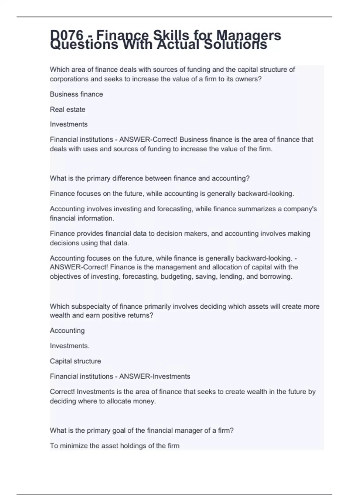 Which area of finance deals with sources of funding and the capital structure of corporations and seeks to increase the value of a firm to its owners? Business finance Real estate Investments Financial institutions - ANSWER-Correct! Business finance is the area of finance that deals with uses and sources of funding to increase the value of the firm. What is the primary difference between finance and accounting? Finance focuses on the future, while accounting is generally backward-looking. Accounting involves investing and forecasting, while finance summarizes a company's financial information. Finance provides financial data to decision makers, and accounting involves making decisions using that data. Accounting focuses on the future, while finance is generally backward-looking. - ANSWER-Correct! Finance is the management and allocation of capital with the objectives of investing, forecasting, budgeting, saving, lending, and borrowing. Which subspecialty of finance primarily involves deciding which assets will create more wealth and earn positive returns? Accounting Investments. Capital structure Financial institutions - ANSWER-Investments Correct! Investments is the area of finance that seeks to create wealth in the future by deciding where to allocate money. What is the primary goal of the financial manager of a firm? To minimize the asset holdings of the firm To maximize the manager's utility To maximize owner wealth To minimize the costs of the firm - ANSWER-To maximize owner wealth Correct! The financial manager should make decisions based on the primary goal of maximizing owner wealth.