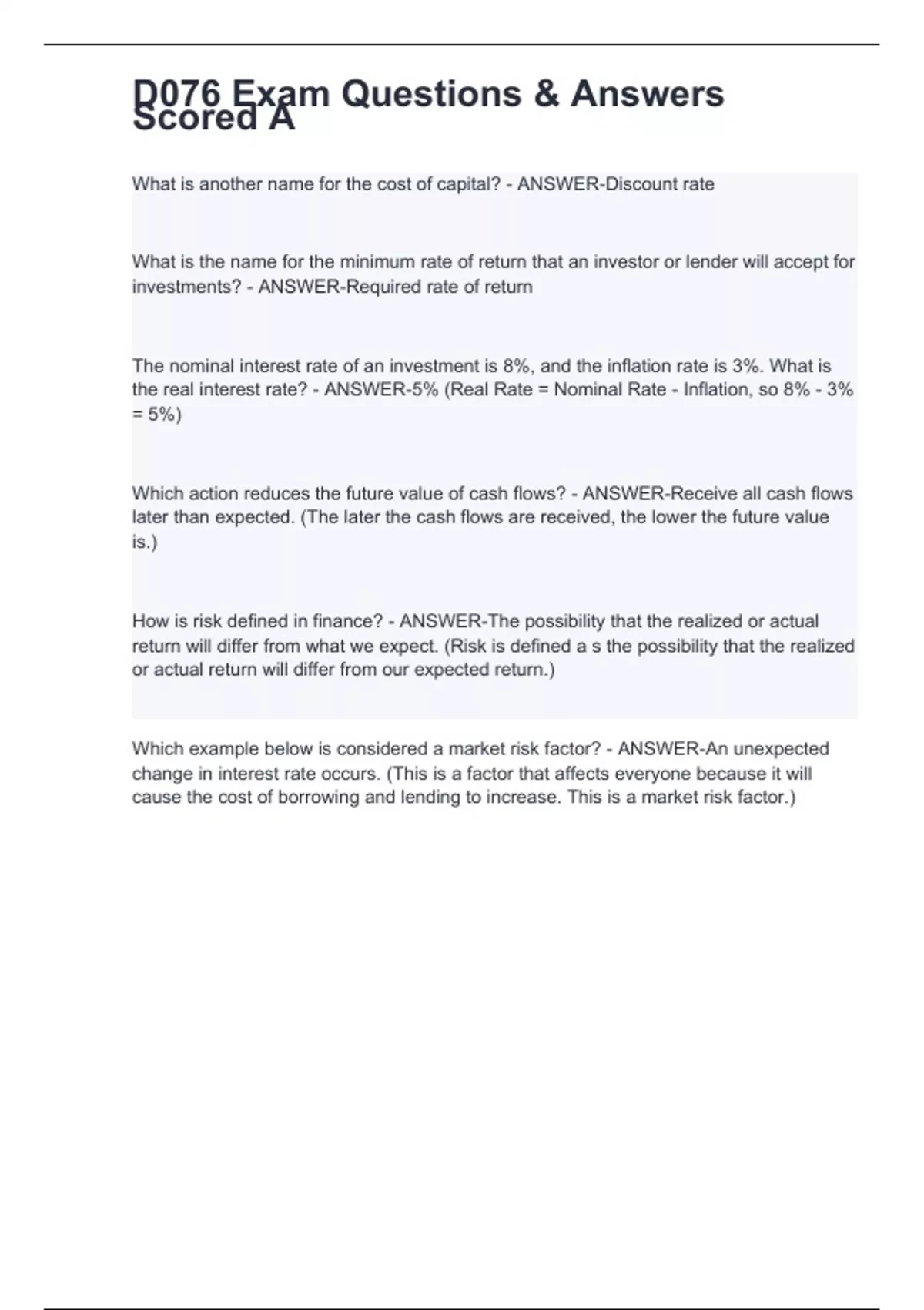 What is another name for the cost of capital? - ANSWER-Discount rate What is the name for the minimum rate of return that an investor or lender will accept for investments? - ANSWER-Required rate of return The nominal interest rate of an investment is 8%, and the inflation rate is 3%. What is the real interest rate? - ANSWER-5% (Real Rate = Nominal Rate - Inflation, so 8% - 3% = 5%) Which action reduces the future value of cash flows? - ANSWER-Receive all cash flows later than expected. (The later the cash flows are received, the lower the future value is.)