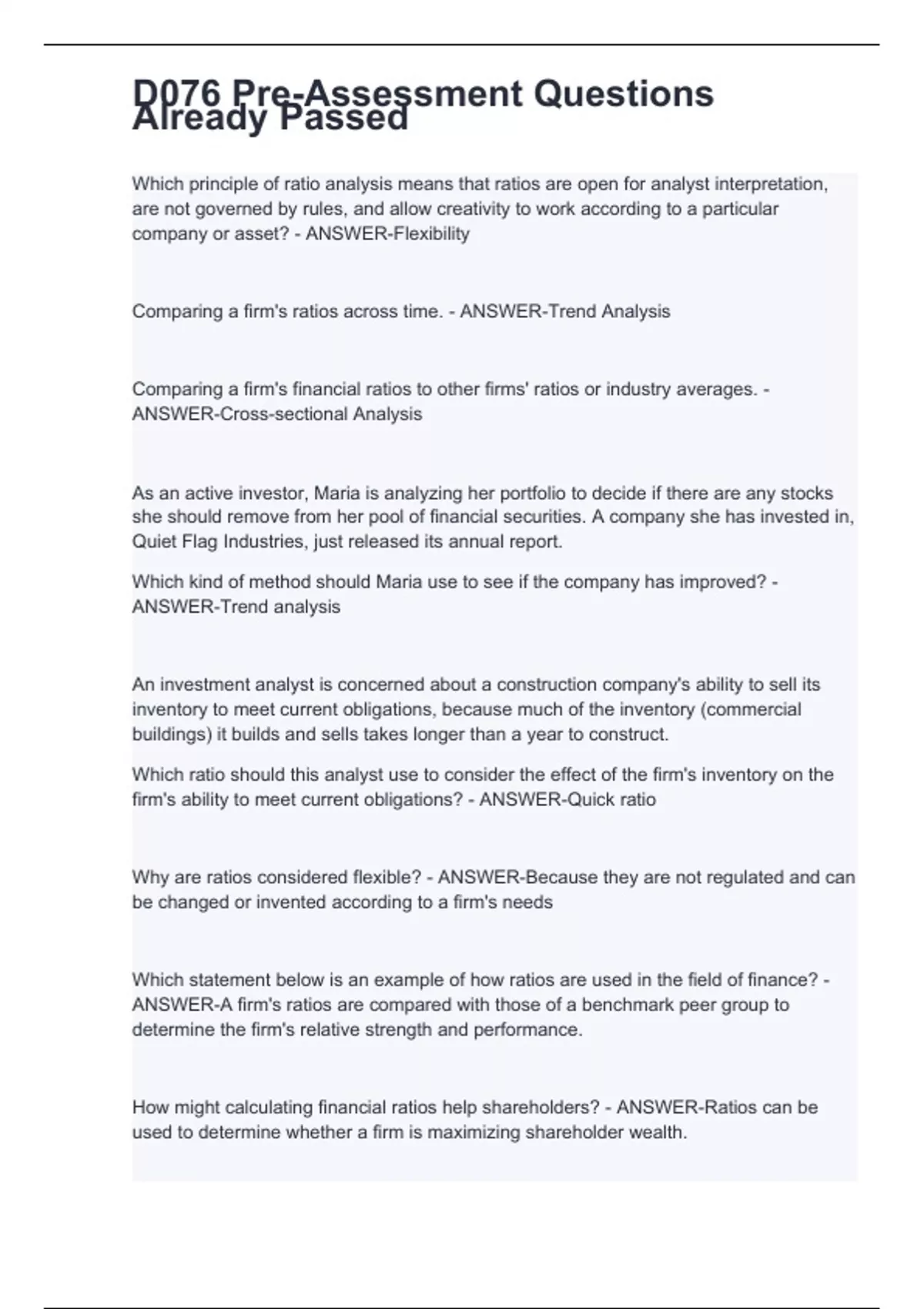 Which principle of ratio analysis means that ratios are open for analyst interpretation, are not governed by rules, and allow creativity to work according to a particular company or asset? - ANSWER-Flexibility Comparing a firm's ratios across time. - ANSWER-Trend Analysis Comparing a firm's financial ratios to other firms' ratios or industry averages. - ANSWER-Cross-sectional Analysis As an active investor, Maria is analyzing her portfolio to decide if there are any stocks she should remove from her pool of financial securities. A company she has invested in, Quiet Flag Industries, just released its annual report. Which kind of method should Maria use to see if the company has improved? - ANSWER-Trend analysis An investment analyst is concerned about a construction company's ability to sell its inventory to meet current obligations, because much of the inventory (commercial buildings) it builds and sells takes longer than a year to construct. Which ratio should this analyst use to consider the effect of the firm's inventory on the firm's ability to meet current obligations? - ANSWER-Quick ratio Why are ratios considered flexible? - ANSWER-Because they are not regulated and can be changed or invented according to a firm's needs Which statement below is an example of how ratios are used in the field of finance? - ANSWER-A firm's ratios are compared with those of a benchmark peer group to determine the firm's relative strength and performance.