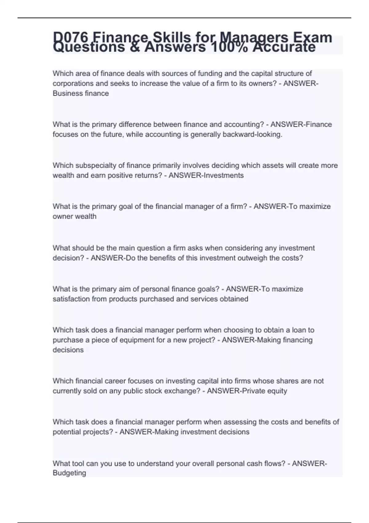 D076 Finance Skills for Managers Exam Questions & Answers 100% Accurate