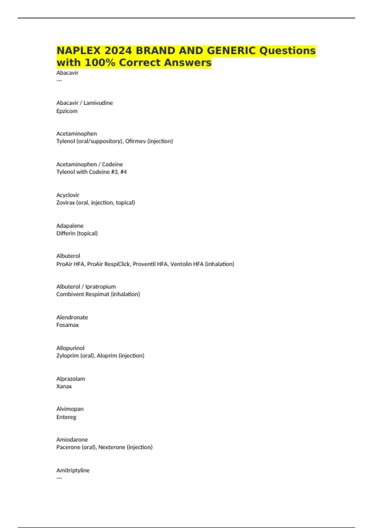 NAPLEX 2024 BRAND AND GENERIC Questions with 100% Correct Answers Abacavir --- Abacavir / Lamivudine Epzicom Acetaminophen Tylenol (oral/suppository), Ofirmev (injection) Acetaminophen / Codeine Tylenol with Codeine #3, #4 Acyclovir Zovirax (oral, injection, topical) Adapalene Differin (topical) Albuterol ProAir HFA, ProAir RespiClick, Proventil HFA, Ventolin HFA (inhalation) Albuterol / Ipratropium Combivent Respimat (inhalation) Alendronate Fosamax Allopurinol Zyloprim (oral), Aloprim (injection) Alprazolam Xanax Alvimopan Entereg Amiodarone Pacerone (oral), Nexterone (injection) Amitriptyline --- Amlodipine Norvasc Amlodipine / Benazepril Lotrel Amoxicillin --- Amoxicillin / Clarithromycin / Lansoprazole Prevpac Amoxicillin / Clavulanate Augmentin Amphetamine / Dextroamphetamine Adderall Ampicillin Generics (oral, injection) Anastrozole Arimidex Apixaban Eliquis Aprepitant Emend Aripiprazole Abilify Atazanavir Reyataz Atenolol Tenormin Atenolol / Chlorthalidone Tenoretic Atomoxetine Strattera Atorvastatin Lipitor Azelastine Astepro (nasal), generics (ophthalmic) Azithromycin Zithromax (oral, injection), Z-Pak (oral) Bacitracin / Neomycin / Polymyxin B / Hydrocortisone Cortisporin (topical) Baclofen Lioresal (intrathecal), generics (oral) Beclomethasone QVAR RediHaler (inhalation) Benazepril Lotensin Benzonatate Tessalon Perles Benztropine Cogentin Betamethasone dipropionate Diprolene Cream AF (topical) Betamethasone / Clotrimazole Lotrisone (topical) Bictegravir / Emtricitabine / Tenofovir alafenamide Biktarvy Bimatoprost Lumigan, Latisse (ophthalmic)