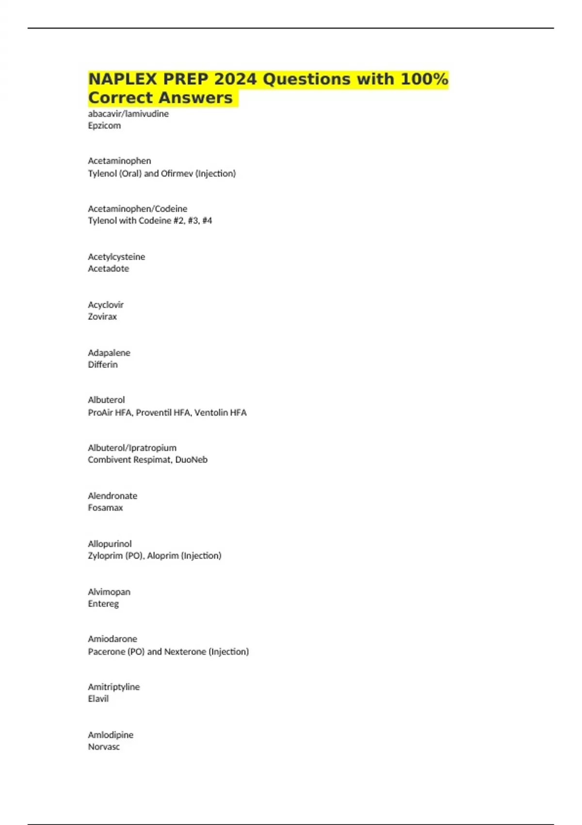 NAPLEX PREP 2024 Questions with 100% Correct Answers abacavir/lamivudine Epzicom Acetaminophen Tylenol (Oral) and Ofirmev (Injection) Acetaminophen/Codeine Tylenol with Codeine #2, #3, #4 Acetylcysteine Acetadote Acyclovir Zovirax Adapalene Differin Albuterol ProAir HFA, Proventil HFA, Ventolin HFA Albuterol/Ipratropium Combivent Respimat, DuoNeb Alendronate Fosamax Allopurinol Zyloprim (PO), Aloprim (Injection) Alvimopan Entereg Amiodarone Pacerone (PO) and Nexterone (Injection) Amitriptyline Elavil Amlodipine Norvasc Amlodipine/Benazepril Lotrel Amoxicillin Amoxil Amoxicillin/Clavulanate Augmentin Amoxicillin/Clarithromycin/ Lansoprazole Prevpac Amphetamine/Dextroamphetamine Adderall Anastrozole Arimidex Apixaban Eliquis Aprepitant Emend Aripiprazole Abilify Atazanavir Reyataz Atenolol Tenormin Atenolol/Chlorthalidone Tenoretic Atomoxetine Strattera Azelastine Astelin, Astepro Azithromycin