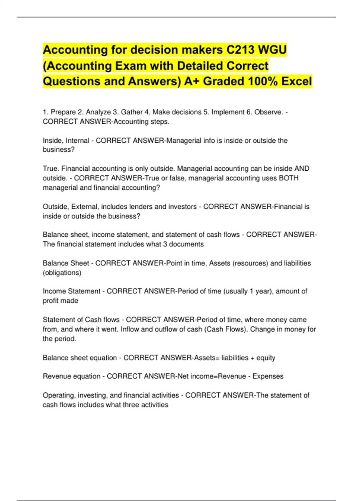 Accounting for decision makers C213 WGU (Accounting Exam with Detailed Correct Questions and Answers) A+ Graded 100% Excel