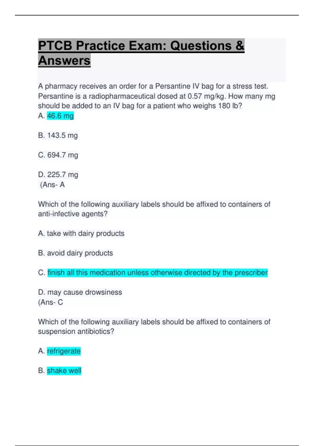 A pharmacy receives an order for a Persantine IV bag for a stress test. Persantine is a radiopharmaceutical dosed at 0.57 mg/kg. How many mg should be added to an IV bag for a patient who weighs 180 lb? A. 46.6 mg B. 143.5 mg C. 694.7 mg D. 225.7 mg (Ans- A Which of the following auxiliary labels should be affixed to containers of anti-infective agents? A. take with dairy products B. avoid dairy products C. finish all this medication unless otherwise directed by the prescriber D. may cause drowsiness (Ans- C Which of the following auxiliary labels should be affixed to containers of suspension antibiotics? A. refrigerate B. shake well