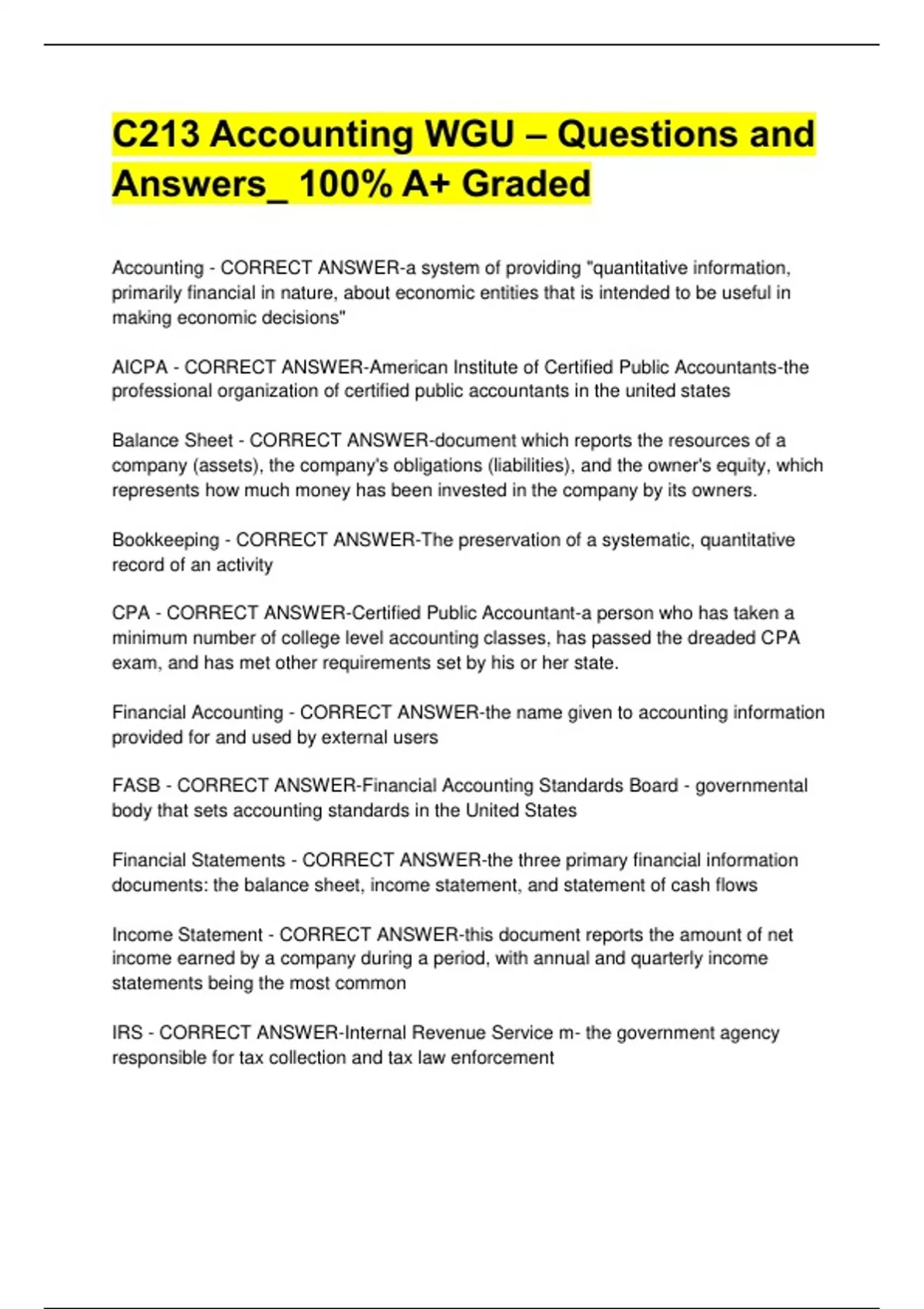 C213 Accounting WGU – Questions and Answers_ 100% A+ Graded
