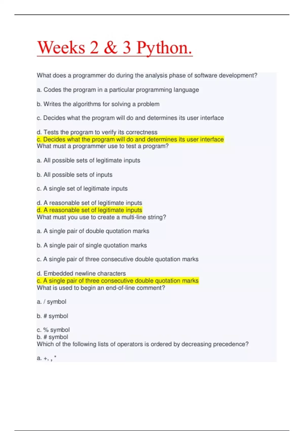 What does a programmer do during the analysis phase of software development? a. Codes the program in a particular programming language b. Writes the algorithms for solving a problem c. Decides what the program will do and determines its user interface d. Tests the program to verify its correctness c. Decides what the program will do and determines its user interface What must a programmer use to test a program? a. All possible sets of legitimate inputs b. All possible sets of inputs c. A single set of legitimate inputs d. A reasonable set of legitimate inputs d. A reasonable set of legitimate inputs What must you use to create a multi-line string? a. A single pair of double quotation marks b. A single pair of single quotation marks c. A single pair of three consecutive double quotation marks d. Embedded newline characters c. A single pair of three consecutive double quotation marks What is used to begin an end-of-line comment? a. / symbol b. # symbol c. % symbol b. # symbol Which of the following lists of operators is ordered by decreasing precedence? a. +, , *