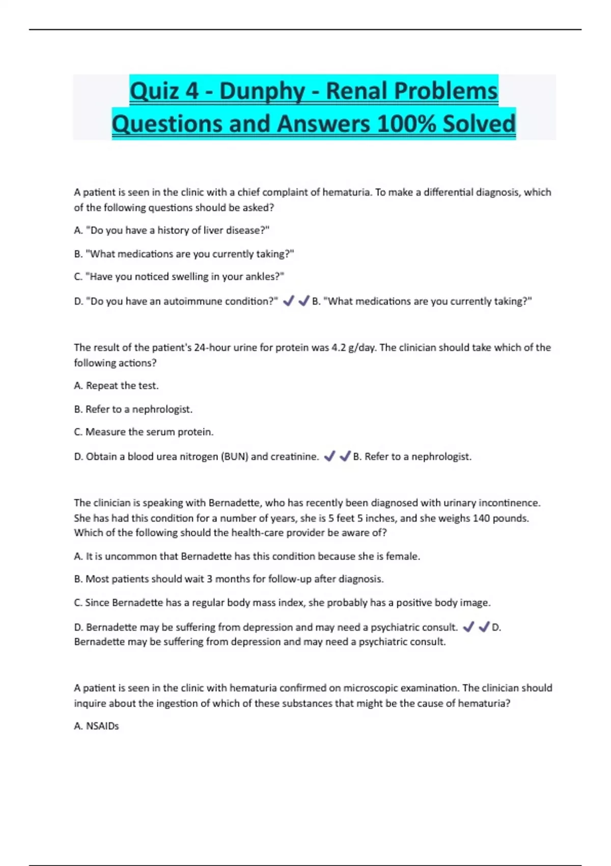 Quiz 4 - Dunphy - Renal Problems Questions and Answers 100% Solved A patient is seen in the clinic with a chief complaint of hematuria. To make a differential diagnosis, which of the following questions should be asked? A. "Do you have a history of liver disease?" B. "What medications are you currently taking?" C. "Have you noticed swelling in your ankles?" D. "Do you have an autoimmune condition?" B. "What medications are you currently taking?" The result of the patient's 24-hour urine for protein was 4.2 g/day. The clinician should take which of the following actions? A. Repeat the test. B. Refer to a nephrologist. C. Measure the serum protein. D. Obtain a blood urea nitrogen (BUN) and creatinine. B. Refer to a nephrologist. The clinician is speaking with Bernadette, who has recently been diagnosed with urinary incontinence. She has had this condition for a number of years, she is 5 feet 5 inches, and she weighs 140 pounds. Which of the following should the health-care provider be aware of? A. It is uncommon that Bernadette has this condition because she is female. B. Most patients should wait 3 months for follow-up after diagnosis. C. Since Bernadette has a regular body mass index, she probably has a positive body image. D. Bernadette may be suffering from depression and may need a psychiatric consult. D. Bernadette may be suffering from depression and may need a psychiatric consult