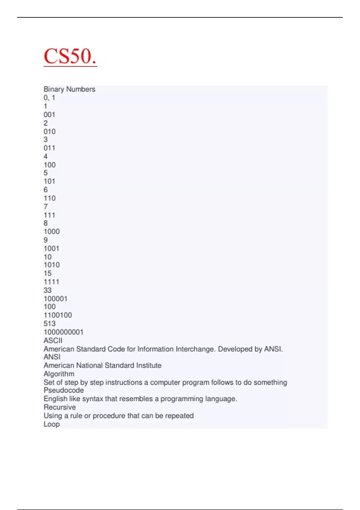 A sequence of steps that will repeat a number of times Statements A category of instructions Boolean Expression A question that is true or false, yes or no, on or off, 0 or 1. Variable Like a container. An allocation of memory for a changeable value. Condition Only occurs if something is true Multi-Threaded Can do multiple things at once ASCII numbers for 0-9 48-57 Binary prefix for 0-9 numbers