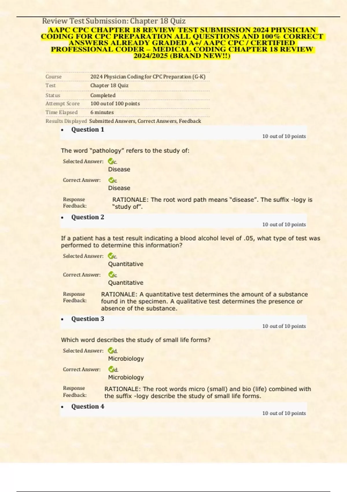 AAPC CPC CHAPTER 18 REVIEW TEST SUBMISSION 2024 PHYSICIAN CODING FOR CPC PREPARATION ALL QUESTIONS AND 100% CORRECT ANSWERS ALREADY GRADED A+/ AAPC CPC / CERTIFIED PROFESSIONAL CODER – MEDICAL CODING CHAPTER 18 REVIEW 2024/2025 (BRAND NEW!!)