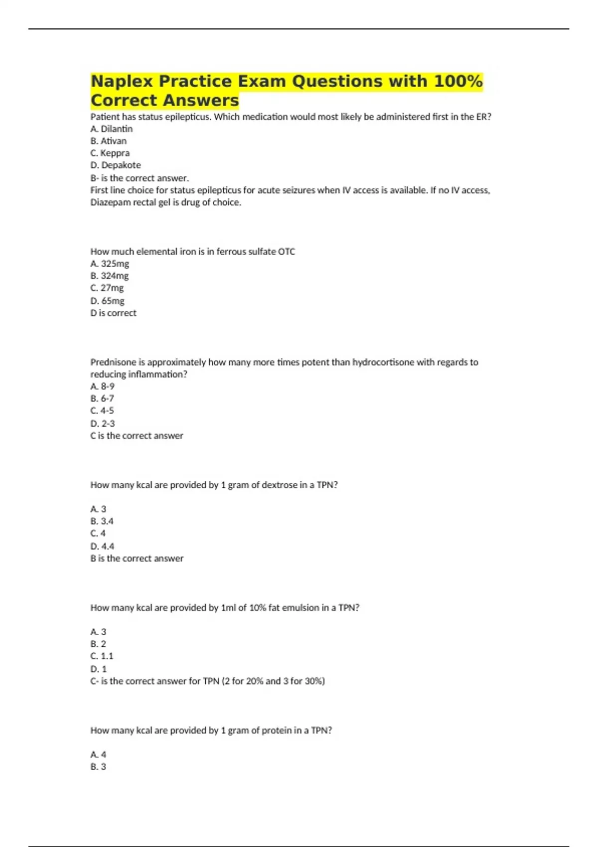 Naplex Practice Exam Questions with 100% Correct Answers Patient has status epilepticus. Which medication would most likely be administered first in the ER? A. Dilantin B. Ativan C. Keppra D. Depakote B- is the correct answer. First line choice for status epilepticus for acute seizures when IV access is available. If no IV access, Diazepam rectal gel is drug of choice. How much elemental iron is in ferrous sulfate OTC A. 325mg B. 324mg C. 27mg D. 65mg D is correct Prednisone is approximately how many more times potent than hydrocortisone with regards to reducing inflammation? A. 8-9 B. 6-7 C. 4-5 D. 2-3 C is the correct answer How many kcal are provided by 1 gram of dextrose in a TPN? A. 3 B. 3.4 C. 4 D. 4.4 B is the correct answer How many kcal are provided by 1ml of 10% fat emulsion in a TPN? A. 3 B. 2 C. 1.1 D. 1 C- is the correct answer for TPN (2 for 20% and 3 for 30%) How many kcal are provided by 1 gram of protein in a TPN? A. 4 B. 3 C. 2 D. 1.1 A- is the correct answer for TPN and EN Which drugs should be avoided in patients with egg allergies? Select ALL that apply. A. Clevidipine B. Propofal C. Cephalexin D. Flublok E. Fluzone A, B, and E all are contraindicated in patients with egg allergies. Elimination rate constant (ke) calculation ke= Cl/Vd Units are hr^-1 Half life (t1/2) calculation t1/2= 0.693/ke CYP Inhibitors G-PACMAN G-grapefruit P- protease inhibitors A-azoles C-cyclosporine/cimetidine M-macrolides A-amiodarone N-Non-dihydropyridine(diltiazem and verapamil) CYP Inducers PS-PORCS P-Phenytoin S-Smoking P-phenobarbital O-oxcarbazepine R-Rifampin C-Carbamazepine S-S wort Corrected Calcium Calculation [(4 - patient's measured albumin level)* 0.8] + Ca level Once made, Phenytoin IV is stable for how long? A. 2 hours B. 4 hours C. 6 hours D. 8 hours B is the correct answer (according to Rx Prep) Phenytoin IV is compatible with what? A. normal saline B. D5W C. D10W D. All the above A. Only compatible with Normal Saline What is the maximum infusion rate for Phenytoin IV? A. 25 mg/min B. 25 mcg/min C. 50 mg/min D. 50 mcg/min C. It is 50 milligrams per minute 95% CI intervals test of DIFFERENCE If the CI interval contains 0 the results are what? A. Statistically significant B. Not Statistically significant C. Non conclusive D. Not enough information B. Not statistically significant