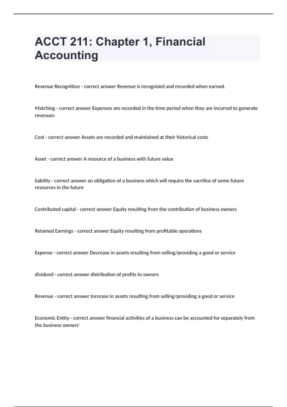 ACCT 211: Chapter 1, Financial Accounting Revenue Recognition - correct answer Revenue is recognized and recorded when earned. Matching - correct answer Expenses are recorded in the time period when they are incurred to generate revenues Cost - correct answer Assets are recorded and maintained at their historical costs Asset - correct answer A resource of a business with future value liability - correct answer an obligation of a business which will require the sacrifice of some future resources in the future Contributed capital - correct answer Equity resulting from the contribution of business owners Retained Earnings - correct answer Equity resulting from profitable operations Expense - correct answer Decrease in assets resulting from selling/providing a good or service dividend - correct answer distribution of profits to owners Revenue - correct answer Increase in assets resulting from selling/providing a good or service Economic Entity - correct answer financial activities of a business can be accounted for separately from the business owners'