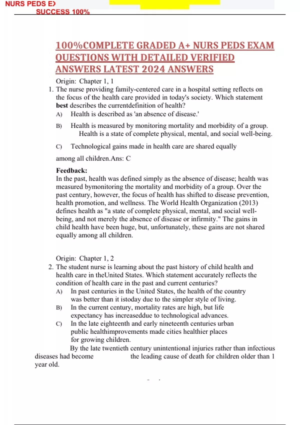 NURS PEDS EXAM QUESTIONS WITH ANSWERS 2024 A+ GUARANTEED SUCCESS 100