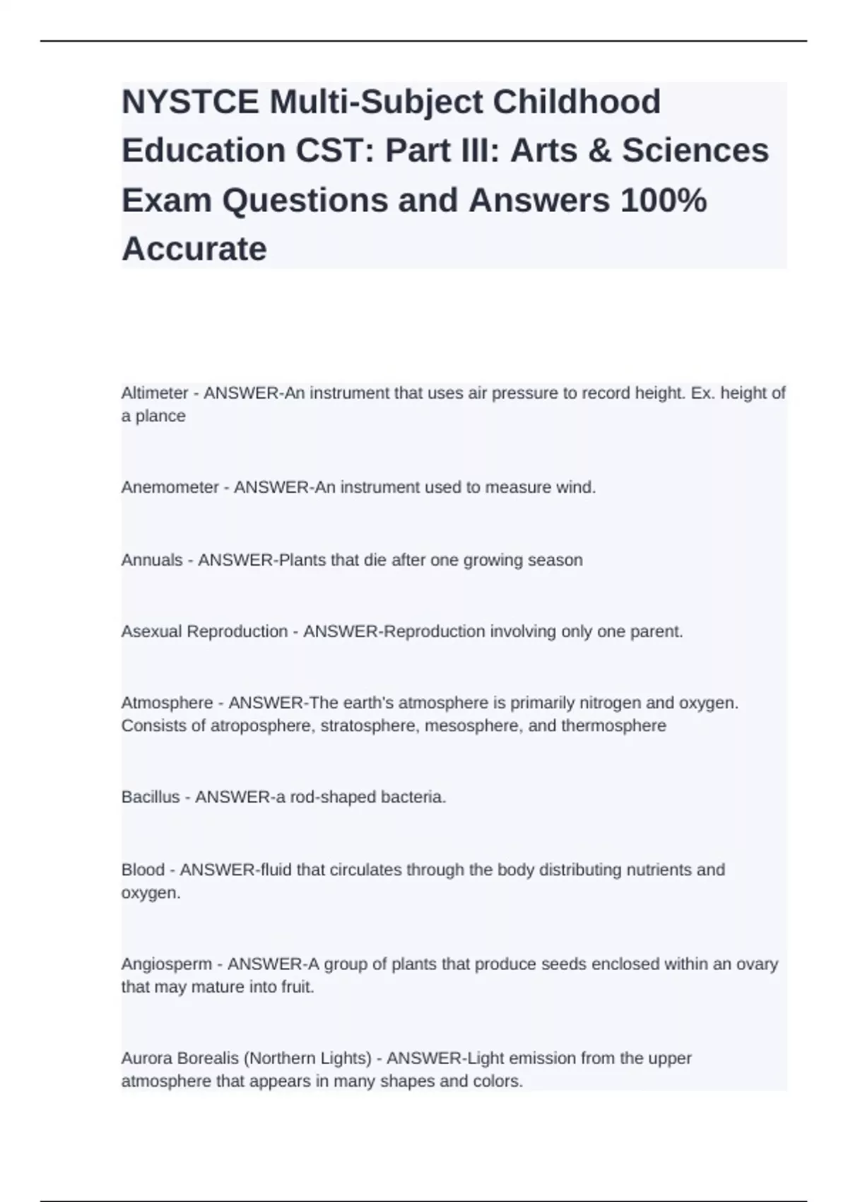 ltimeter - ANSWER-An instrument that uses air pressure to record height. Ex. height of a plance Anemometer - ANSWER-An instrument used to measure wind. Annuals - ANSWER-Plants that die after one growing season Asexual Reproduction - ANSWER-Reproduction involving only one parent. Atmosphere - ANSWER-The earth's atmosphere is primarily nitrogen and oxygen. Consists of atroposphere, stratosphere, mesosphere, and thermosphere Bacillus - ANSWER-a rod-shaped bacteria. Blood - ANSWER-fluid that circulates through the body distributing nutrients and oxygen. Angiosperm - ANSWER-A group of plants that produce seeds enclosed within an ovary that may mature into fruit. Aurora Borealis (Northern Lights) - ANSWER-Light emission from the upper atmosphere that appears in many shapes and colors. Carcinogen - ANSWER-A substance that causes cancer. Carnivore - ANSWER-An organism that eats meat which includes animals, plants, and fungi. Chemotherapy - ANSWER-A chemical that is toxic to malignant cancer cells. Canopy - ANSWER-A layer of tree branches and vegetation elevated above the ground. Carbon Dioxide (CO2) - ANSWER-A colorless, odorless that is important to the Earth's atmospheric greenhouse effect. Frozen CO2 is dry ice. Carcinoma - ANSWER-A malignant tumer that forms in the skin outside the internal organs.