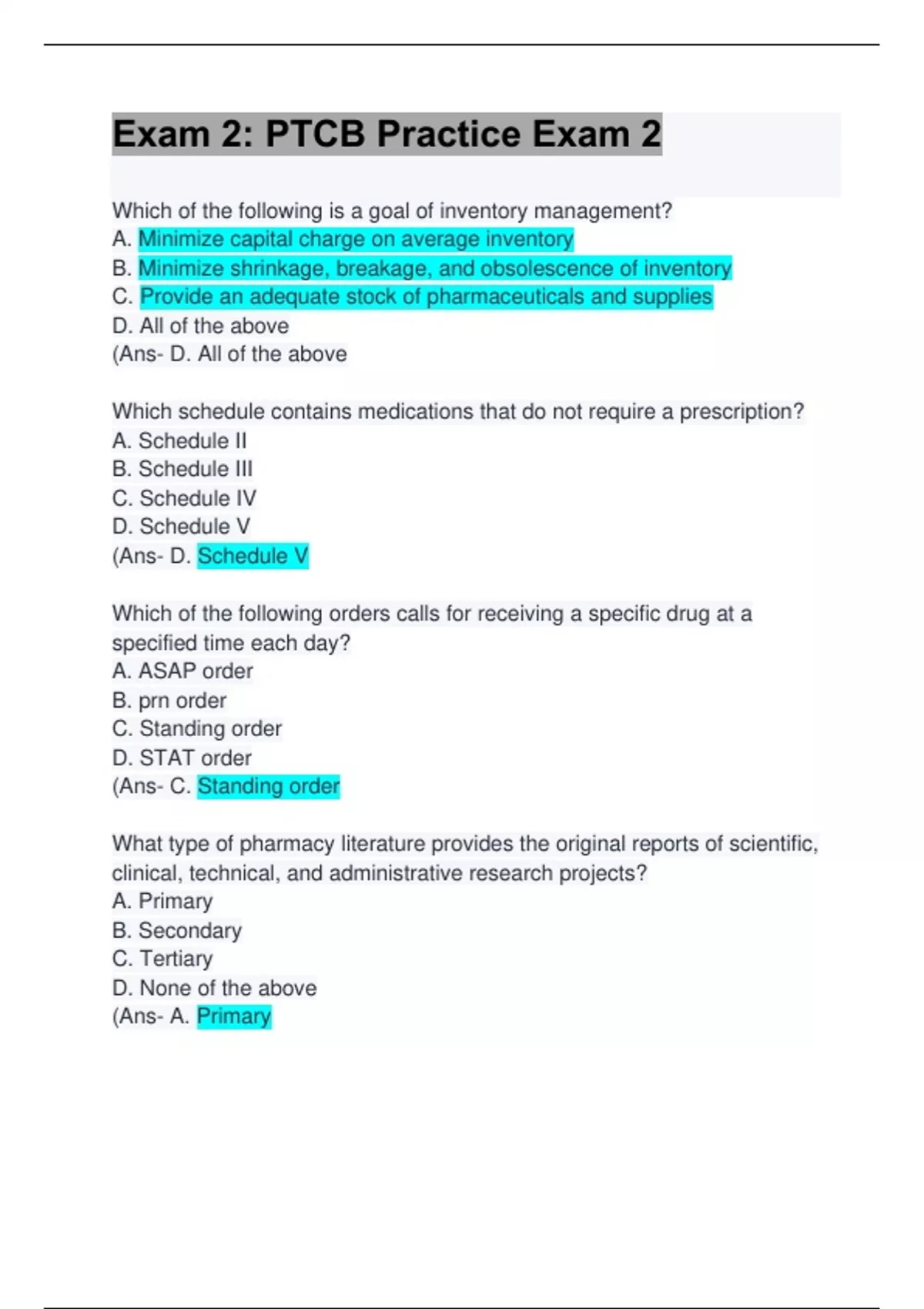 Which of the following is a goal of inventory management? A. Minimize capital charge on average inventory B. Minimize shrinkage, breakage, and obsolescence of inventory C. Provide an adequate stock of pharmaceuticals and supplies D. All of the above (Ans- D. All of the above Which schedule contains medications that do not require a prescription? A. Schedule II B. Schedule III C. Schedule IV D. Schedule V (Ans- D. Schedule V Which of the following orders calls for receiving a specific drug at a specified time each day? A. ASAP order B. prn order C. Standing order D. STAT order (Ans- C. Standing order What type of pharmacy literature provides the original reports of scientific, clinical, technical, and administrative research projects? A. Primary B. Secondary C. Tertiary D. None of the above (Ans- A. Primary Why is it important t