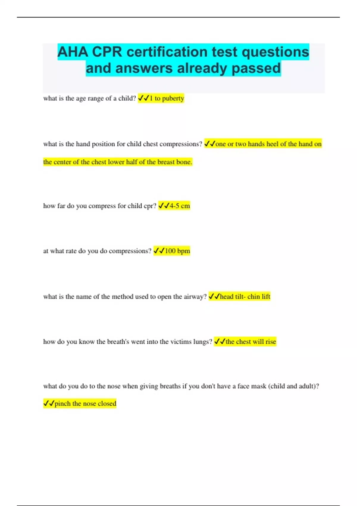 AHA CPR certification test questions and answers already passed latest