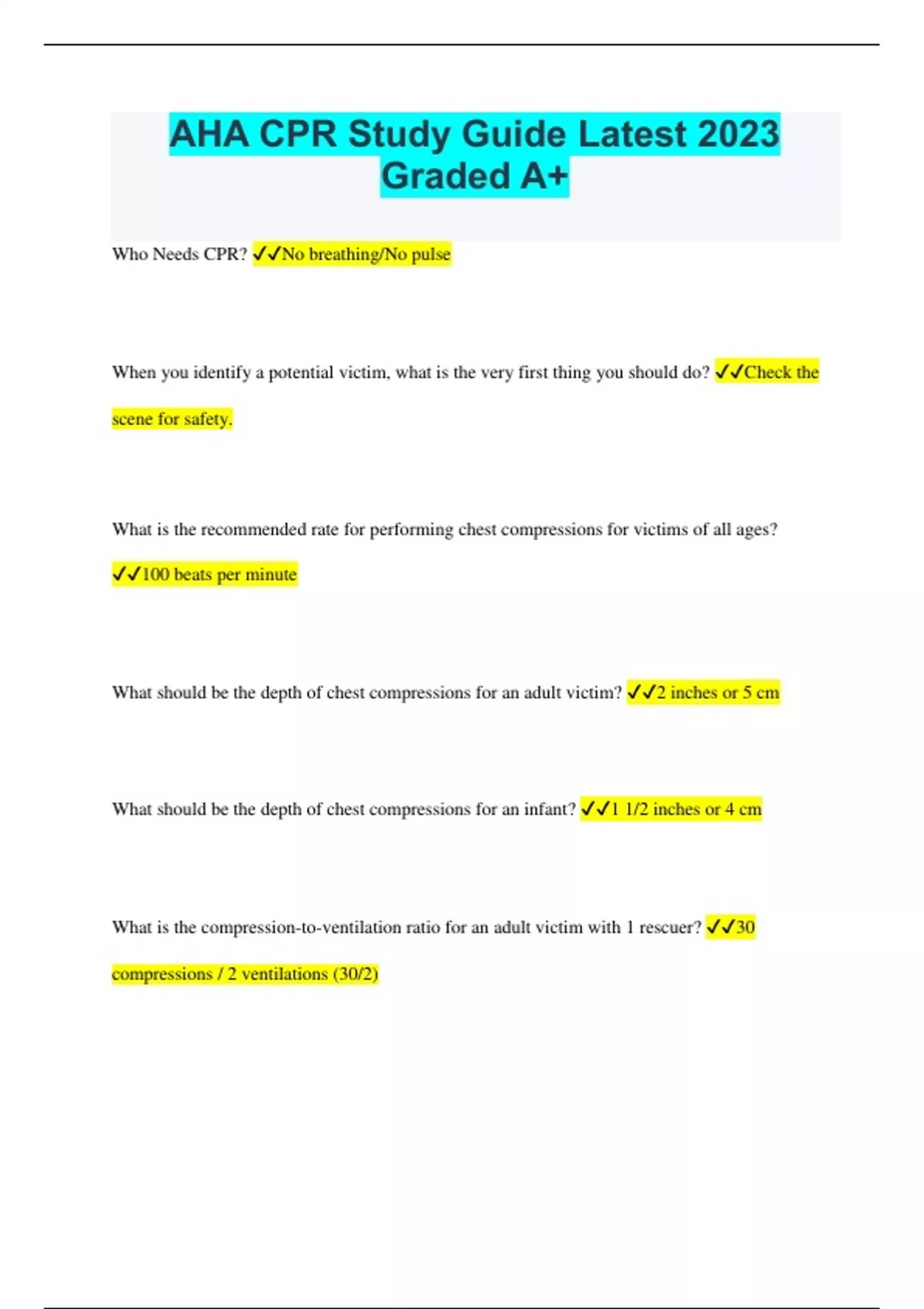 AHA CPR Study Guide Latest 2024 Graded A+