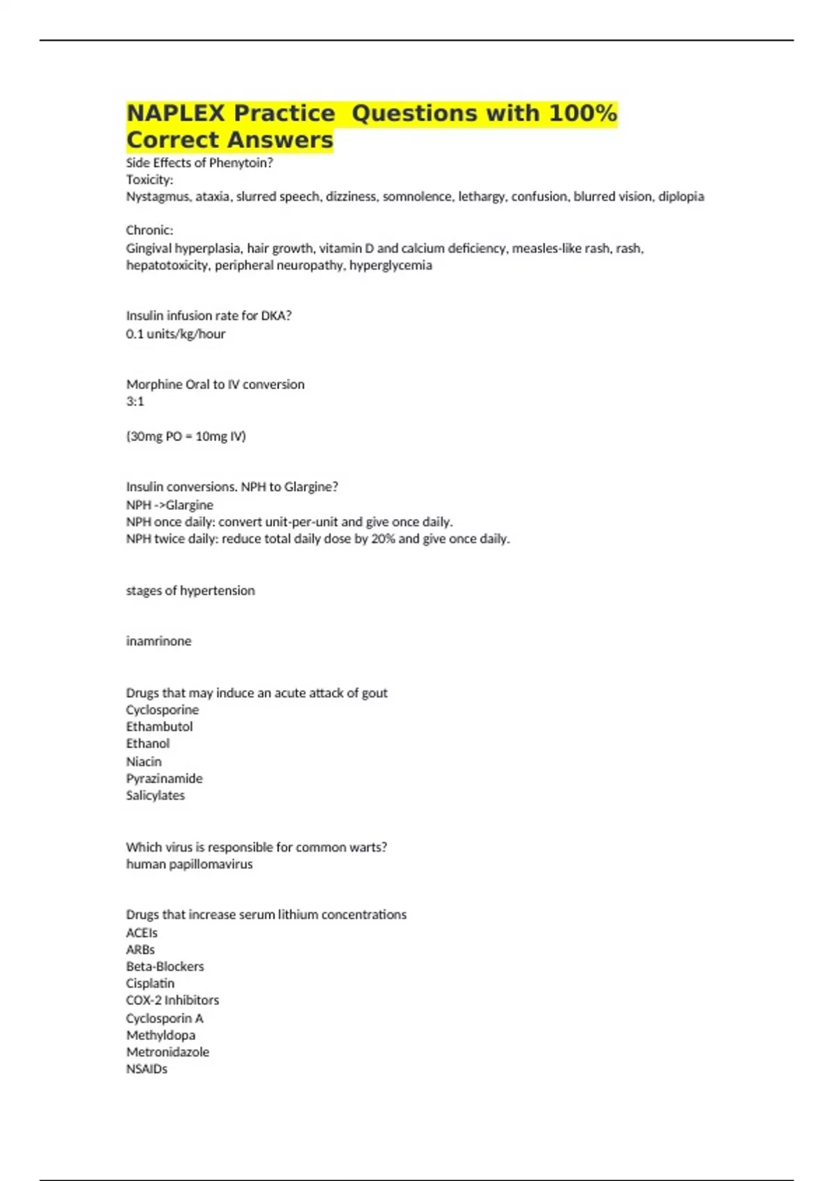 NAPLEX Practice Questions with 100% Correct Answers Side Effects of Phenytoin? Toxicity: Nystagmus, ataxia, slurred speech, dizziness, somnolence, lethargy, confusion, blurred vision, diplopia Chronic: Gingival hyperplasia, hair growth, vitamin D and calcium deficiency, measles-like rash, rash, hepatotoxicity, peripheral neuropathy, hyperglycemia Insulin infusion rate for DKA? 0.1 units/kg/hour Morphine Oral to IV conversion 3:1 (30mg PO = 10mg IV) Insulin conversions. NPH to Glargine? NPH -Glargine NPH once daily: convert unit-per-unit and give once daily. NPH twice daily: reduce total daily dose by 20% and give once daily. stages of hypertension inamrinone Drugs that may induce an acute attack of gout Cyclosporine Ethambutol Ethanol Niacin Pyrazinamide Salicylates Which virus is responsible for common warts? human papillomavirus Drugs that increase serum lithium concentrations ACEIs ARBs Beta-Blockers Cisplatin COX-2 Inhibitors Cyclosporin A Methyldopa Metronidazole NSAIDs Phenytoin Tetracycline Thiazide diuretics Verapamil Drugs that decrease serum lithium concentrations Acetazolamide Aminophylline Caffeine Mineralcorticoids Nifedipine Osmotic diuretics Sodium bicarb Theophylline Drug of choice for treating tremor in Parkinson's Disease Anticholinergics - Trihexphenidyl (Artane) - Benztropine (Cogentin) Which condition is caused by a deficiency of Vitamin B12? Macrocytic anemia Which of the following is a possible side effect from the long-term use of heparin therapy? Osteoporosis can occur with long-term use. Women who are pregnant and are using heparin long-term are at risk for decreased bone density. Next These clinical scenarios are appropriate for monitoring LMWH therapy. Significant renal impairment Pregnant patient with PE Pregnant patient with mechanical heart valves Extremes of body weight Aspirin MOA Aspirin work by binding irreversibly to COX-1 and COX-2 resulting in a decrease of prostaglandin synthesis and a decrease in thromboxane A2 synthesis. Thromboxane A2 is a potent vasoconstrictor and induces platelet aggregation. ________________________ are first-line agents in treating chronic stable angina. Beta blockers (without ISA) are first-line agents in treating chronic stable angina. patient counseling for Nitrolingual Pumpspray: Instruct patients to spray 5 times into the air to prime the pump the first time they use it, and prime it again with 1 spray if they have not used it for 6 weeks. Do NOT shake. Press the button firmly with the forefinger to release the spray onto or under the tongue. Do not inhale the spray and try not to swallow too quickly afterwards. rare but serious adverse reaction that can be due to clopidogrel Thrombotic thrombocytopenic purpura (TTP) Non-dihydropyridine calcium channel blockers should not be used in combination with beta-blockers due to ___________________________________ Non-dihydropyridine calcium channel blockers should not be used in combination with beta-blockers due to the risk for excessive bradycardia preferred agents for treating (Prinzmetal's) variant angina Calcium channel blockers Why is cimetidine used less than other H2-antagonists? Cimetidine can cause tender, swollen breast tissue. Impotence is another side effe