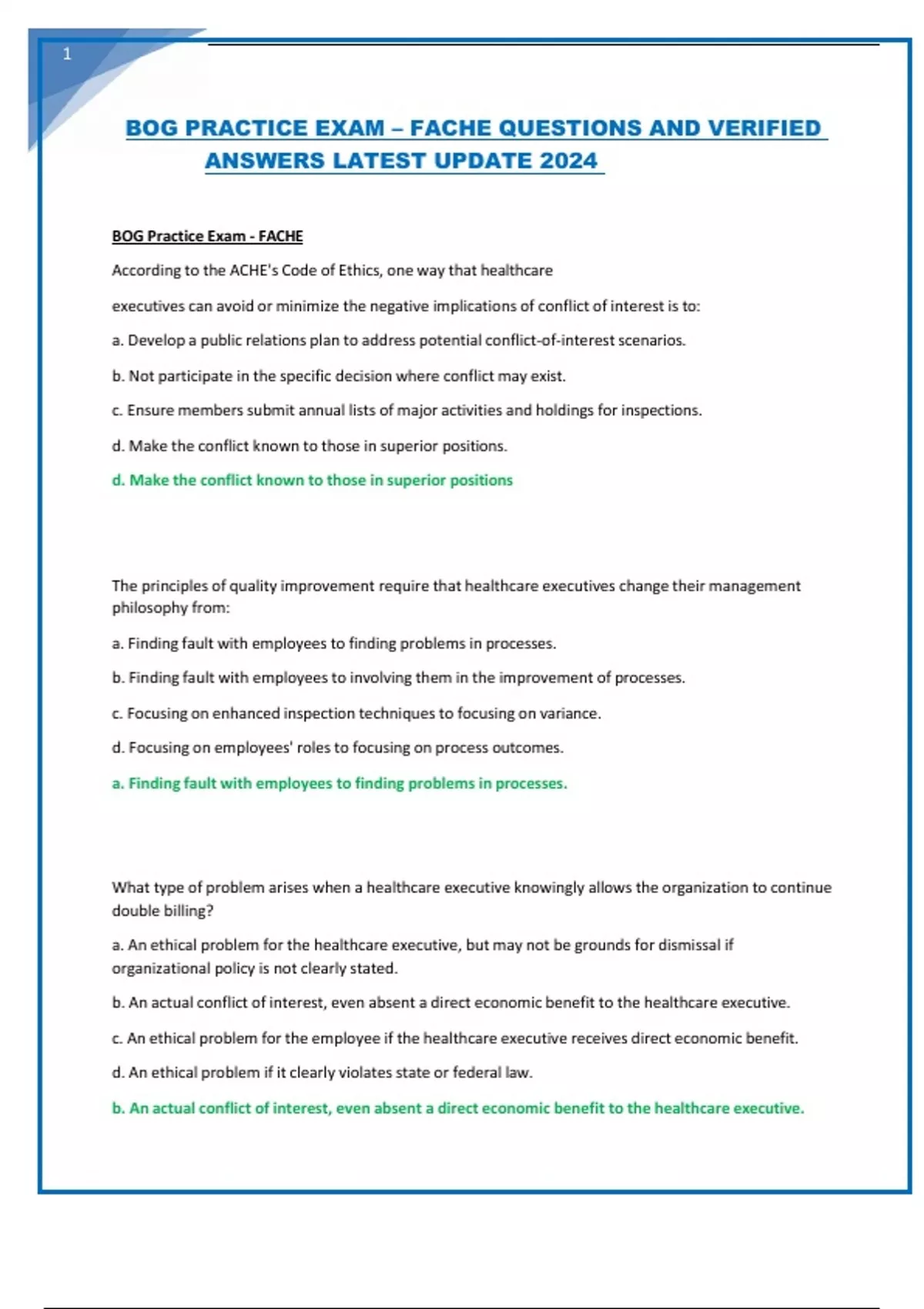 BOG PRACTICE EXAM – FACHE QUESTIONS AND VERIFIED ANSWERS LATEST UPDATE 2024