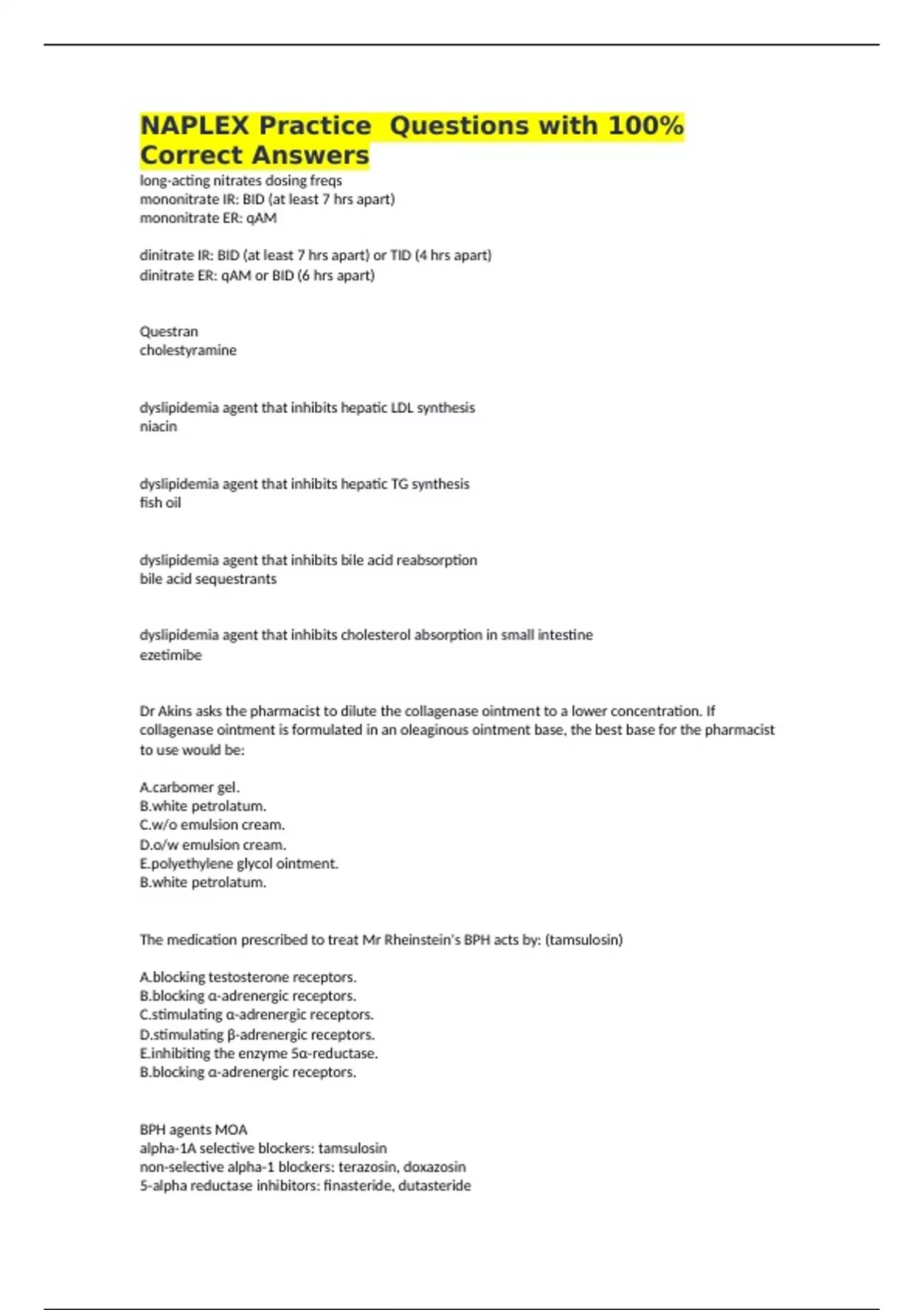 NAPLEX Practice Questions with 100% Correct Answers long-acting nitrates dosing freqs mononitrate IR: BID (at least 7 hrs apart) mononitrate ER: qAM dinitrate IR: BID (at least 7 hrs apart) or TID (4 hrs apart) dinitrate ER: qAM or BID (6 hrs apart) Questran cholestyramine dyslipidemia agent that inhibits hepatic LDL synthesis niacin dyslipidemia agent that inhibits hepatic TG synthesis fish oil dyslipidemia agent that inhibits bile acid reabsorption bile acid sequestrants dyslipidemia agent that inhibits cholesterol absorption in small intestine ezetimibe Dr Akins asks the pharmacist to dilute the collagenase ointment to a lower concentration. If collagenase ointment is formulated in an oleaginous ointment base, the best base for the pharmacist to use would be: A.carbomer gel. B.white petrolatum. C.w/o emulsion cream. D.o/w emulsion cream. E.polyethylene glycol ointment. B.white petrolatum. The medication prescribed to treat Mr Rheinstein's BPH acts by: (tamsulosin) A.blocking testosterone receptors. B.blocking α-adrenergic receptors. C.stimulating α-adrenergic receptors. D.stimulating β-adrenergic receptors. E.inhibiting the enzyme 5α-reductase. B.blocking α-adrenergic receptors. BPH agents MOA alpha-1A selective blockers: tamsulosin non-selective alpha-1 blockers: terazosin, doxazosin 5-alpha reductase inhibitors: finasteride, dutasteride PDE-5 inhibitors: tadalafil Ascorbic acid is added to formulations of epinephrine to prevent: A.oxidation. B.hydrolysis. C.evaporation. D.precipitation. E.decarboxylation. A.oxidation. Which of the following can increase the dissolution rate of a drug? (Select ALL that apply)
