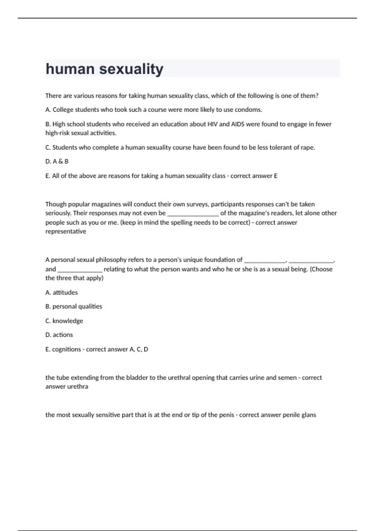 human sexualityThere are various reasons for taking human sexuality class, which of the following is one of them? A. College students who took such a course were more likely to use condoms. B. High school students who received an education about HIV and AIDS were found to engage in fewer high-risk sexual activities. C. Students who complete a human sexuality course have been found to be less tolerant of rape. D. A & B E. All of the above are reasons for taking a human sexuality class - correct answer E Though popular magazines will conduct their own surveys, participants responses can't be taken seriously. Their responses may not even be _______________ of the magazine's readers, let alone other